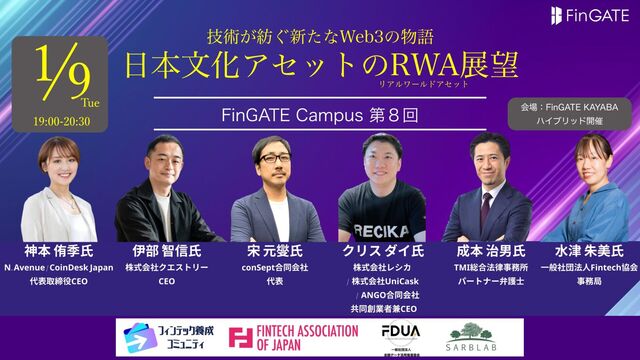 2024年1月9日に行われた『日本文化アセットのRWA展望〜FinGATE Campus 第8回(フィンテック養成勉強会#38)』の進行スライド。 https://fintech-engineer.connpass.com/event/305424/