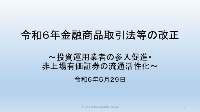 ③ 上記①及び②の有価証券に表示される権利であり、金商法の規定により有価証券とみなされるもの ④ 上記のほか、当該行為を安定的に行うことが困難となった場合であっても多数の者に影響を及ぼすおそれ が少ないと認められる有価証券として政令で定めるもの 非上場有価証券のみを取り扱うPTS業務の参入要件の緩和 ⓒHori & Partners All rights reserved 50