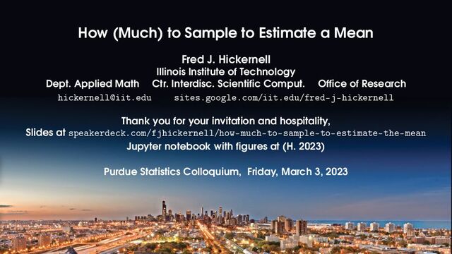Hickernell Illinois Institute of Technology Dept. Applied Math Ctr. Interdisc. Scientific Comput. Office of Research [email protected] sites.google.com/iit.edu/fred-j-hickernell Thank you for your invitation and hospitality, Slides at speakerdeck.com/fjhickernell/how-much-to-sample-to-estimate-the-mean Jupyter notebook with figures at (H. 2023) Purdue Statistics Colloquium, Friday, March 3, 2023