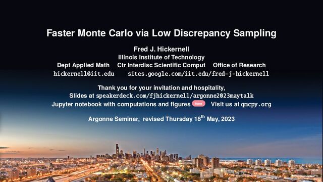 Illinois Institute of Technology Dept Applied Math Ctr Interdisc Scientific Comput Office of Research [email protected] sites.google.com/iit.edu/fred-j-hickernell Thank you for your invitation and hospitality, Slides at speakerdeck.com/fjhickernell/argonne2023maytalk Jupyter notebook with computations and figures here Visit us at qmcpy.org Argonne Seminar, revised Thursday 18th May, 2023