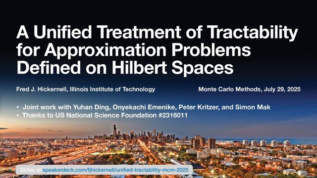 An adaptive algorithm employing continuous linear functionals. In: P. L'Ecuyer, B. Tu ff i n (eds.) Monte Carlo and Quasi-Monte Carlo Methods: MCQMC, Rennes, France, July 2018, Springer Proceedings in Mathematics and Statistics, vol. 324, pp. 161–181. Springer, Cham (2020). DOI: 10.1007/978-3-030-43465-6\_8 Ding, Y., Hickernell, F.J., Kritzer, P., Mak, S.: Adaptive approximation for multivariate linear problems with inputs lying in a cone. In: F.J. Hickernell, P. Kritzer (eds.) Multivariate Algorithms and Information-Based Complexity, pp. 109–145. DeGruyter, Berlin/Boston (2020). DOI: 10.1515/9783110635461-007} Emenike, O., Hickernell, F.J., Kritzer, P.: A uni fi ed treatment of tractability for approximation problems de fi ned on Hilbert spaces. J. Complexity 84, 101856 (2024). DOI: 10.1016/j.jco.2024.101856 Krieg, D., Kritzer, P.: Homogeneous algorithms and solvable problems on cones. J.\ Complexity 83, 101840 (2024). DOI: 10.1016/j.jco.2024.101840 Novak, E., Woźniakowski, H.: Tractability of Multivariate Problems Volume I: Linear Information. No. 6 in EMS Tracts in Mathematics. European Mathematical Society, Zürich (2008) Novak, E., Woźniakowski, H.: Tractability of Multivariate Problems Volume III: Standard Information for Operators. No. 18 in EMS Tracts in Mathematics. European Mathematical Society, Zürich (2012) 14