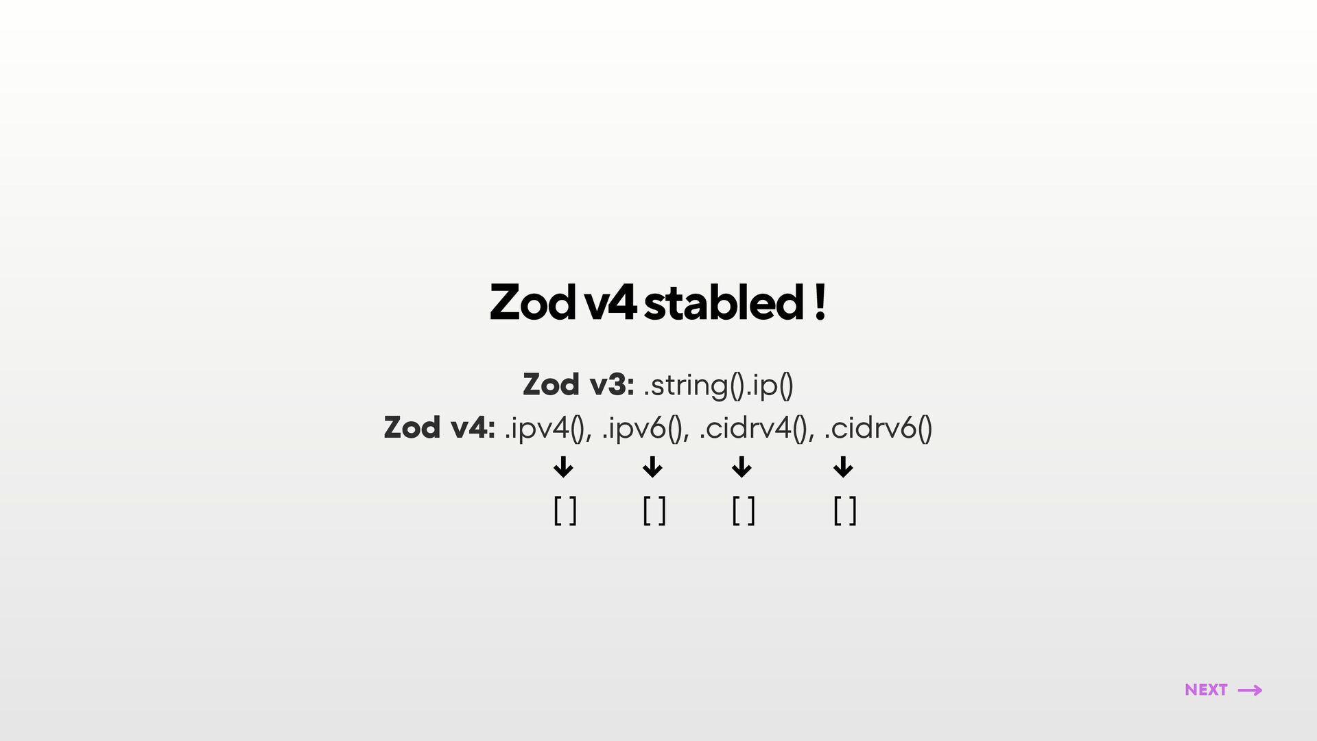 Zod v3: .string().ip() Zod v4: .ipv4(), .ipv6(), .cidrv4(), .cidrv6() Zod