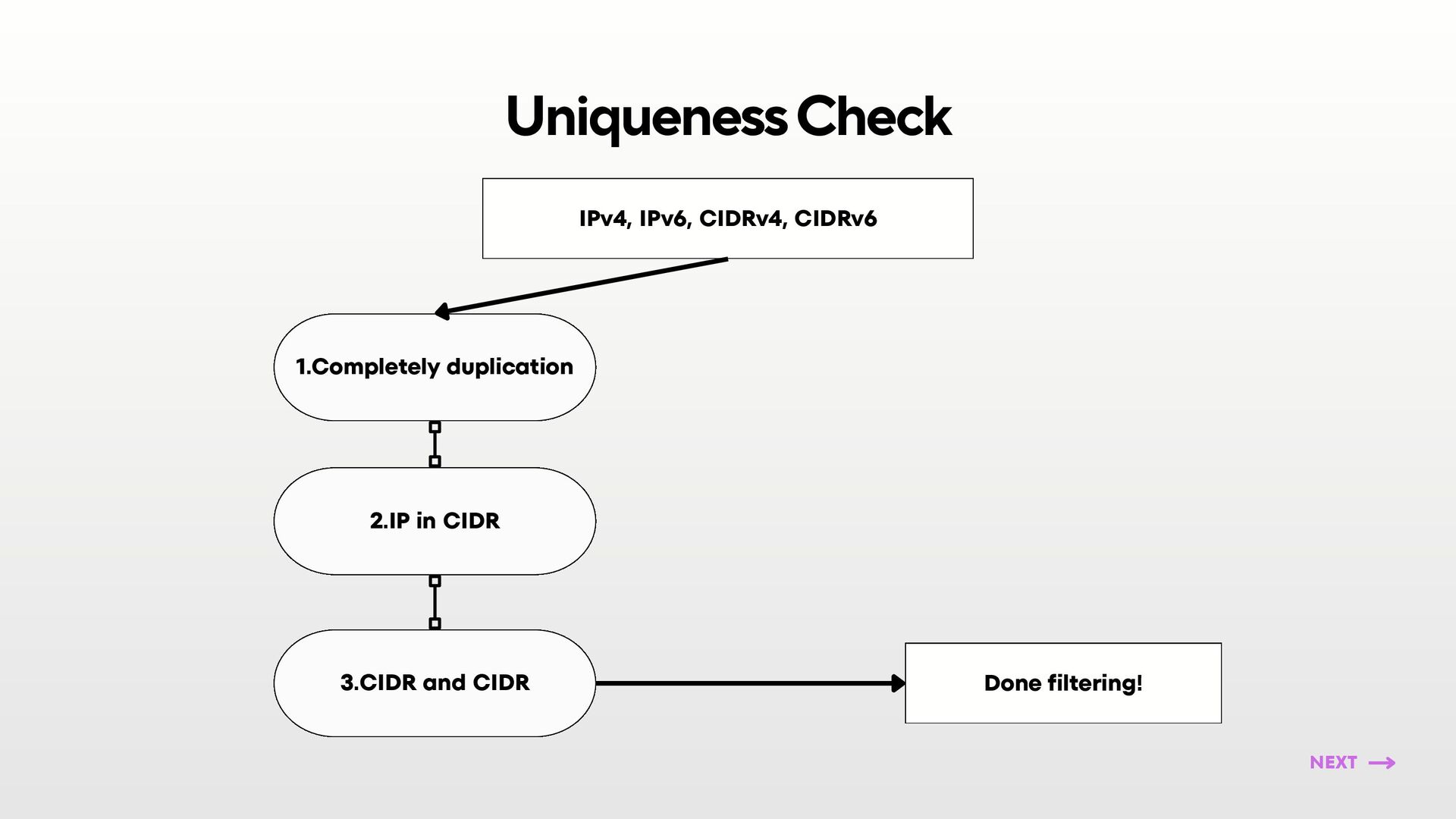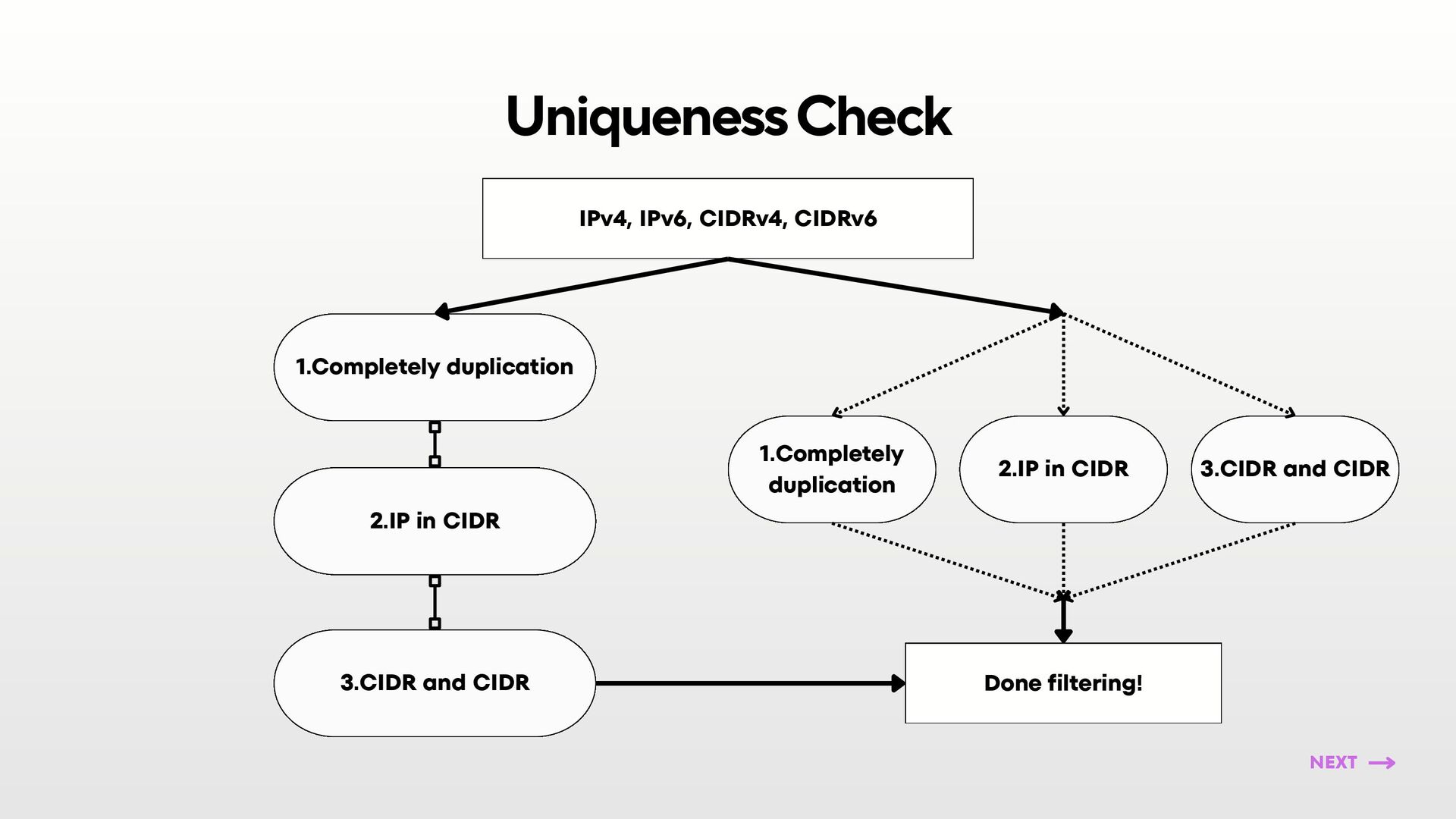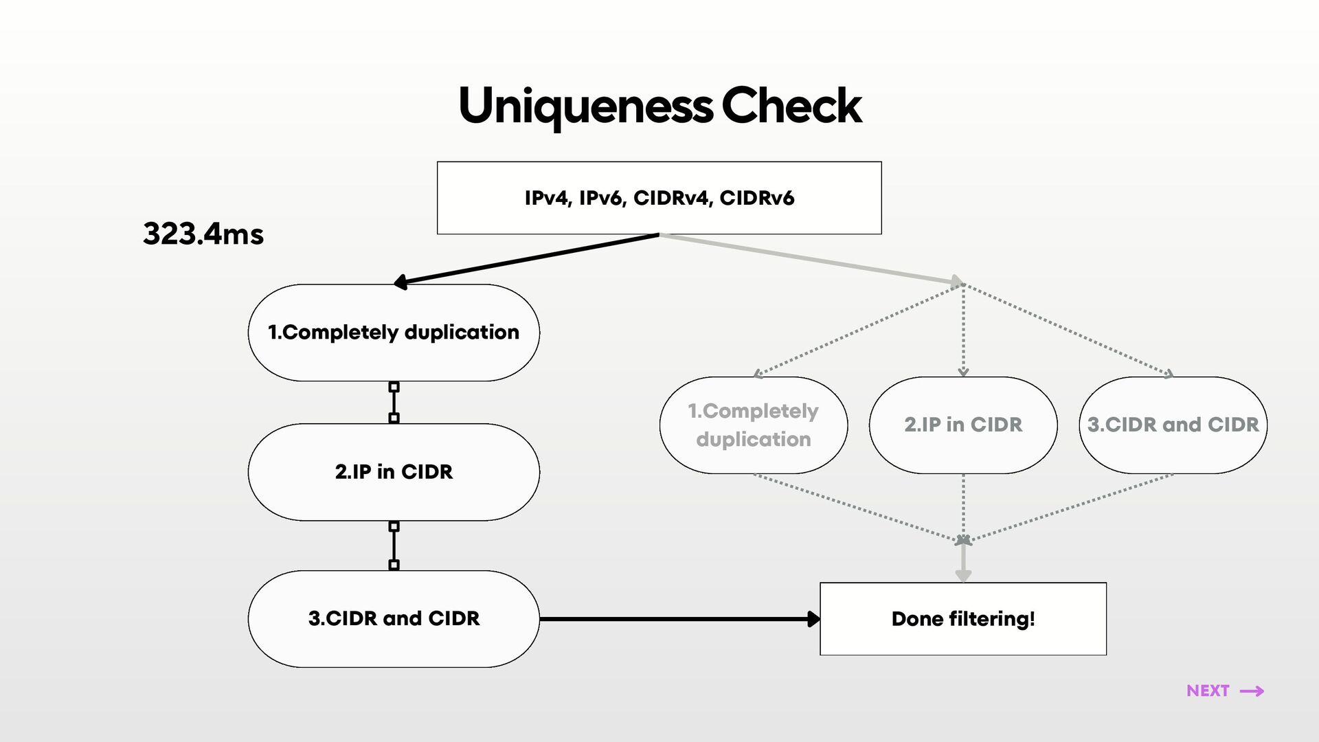 CIDRv4, CIDRv6 1.Completely duplication 2.IP in CIDR 3.CIDR and CIDR Done filtering! Uniqueness Check NEXT 323.4ms