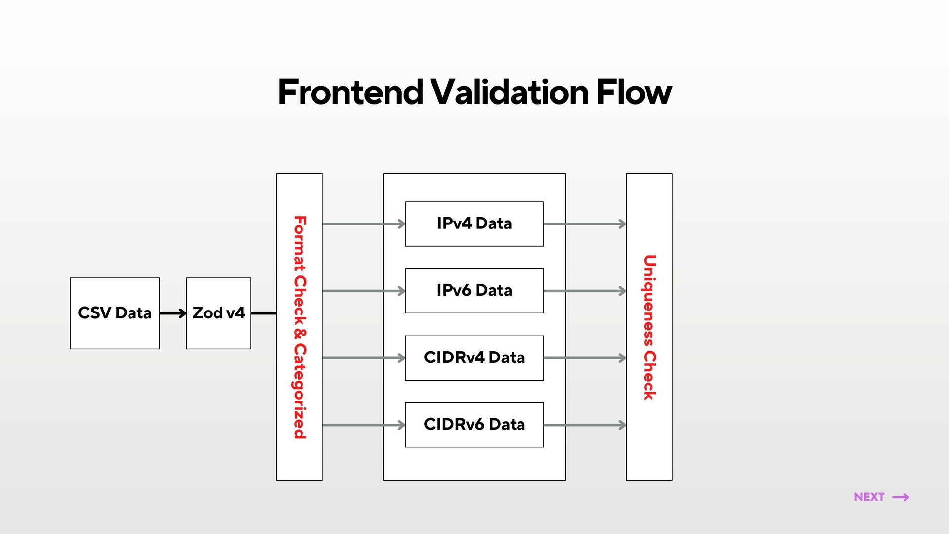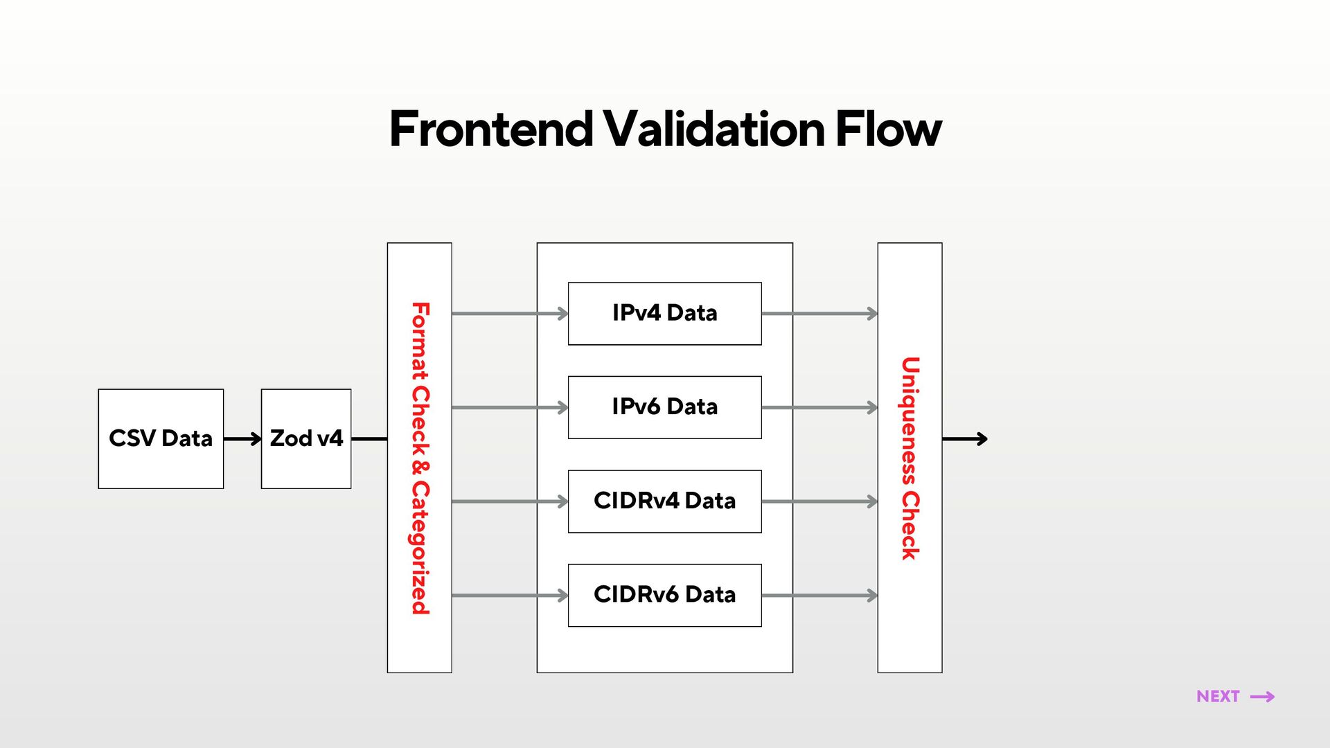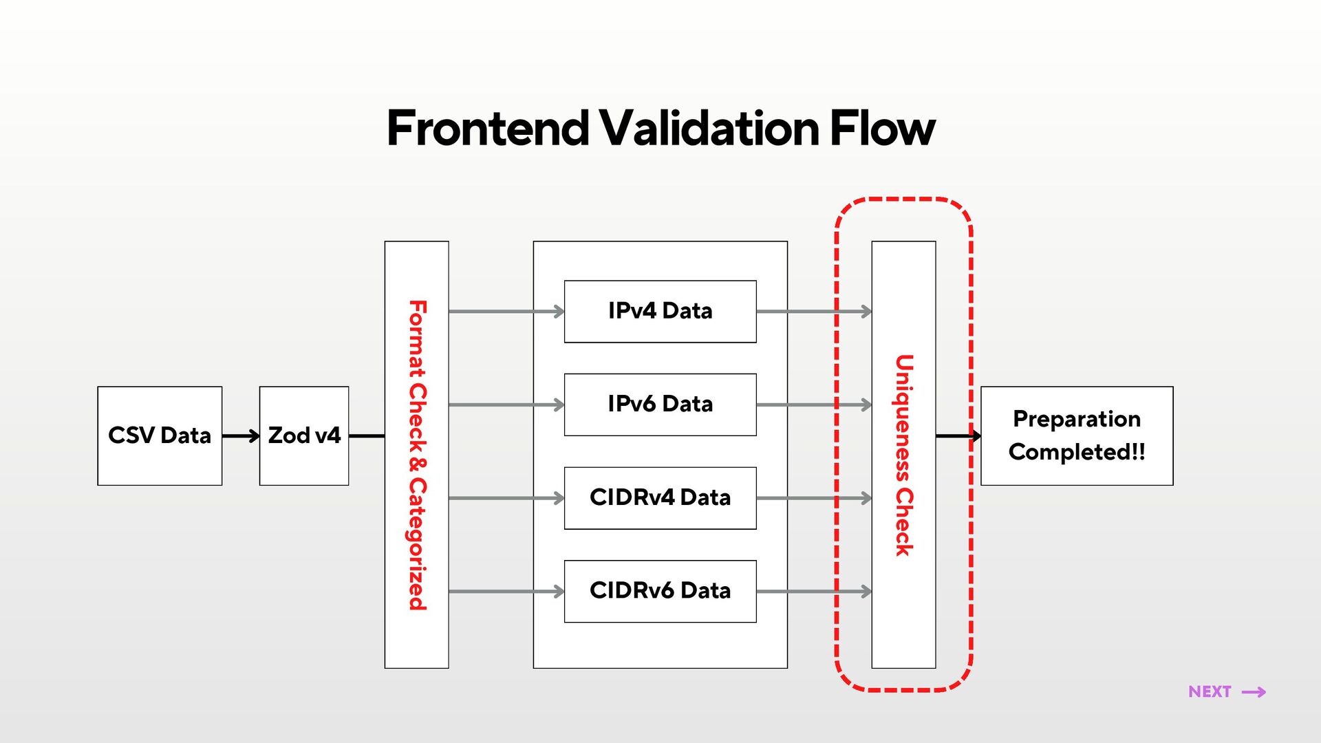 CIDRv4, CIDRv6 1.Completely duplication 2.IP in CIDR 3.CIDR and CIDR Done filtering! Uniqueness Check NEXT 323.4ms