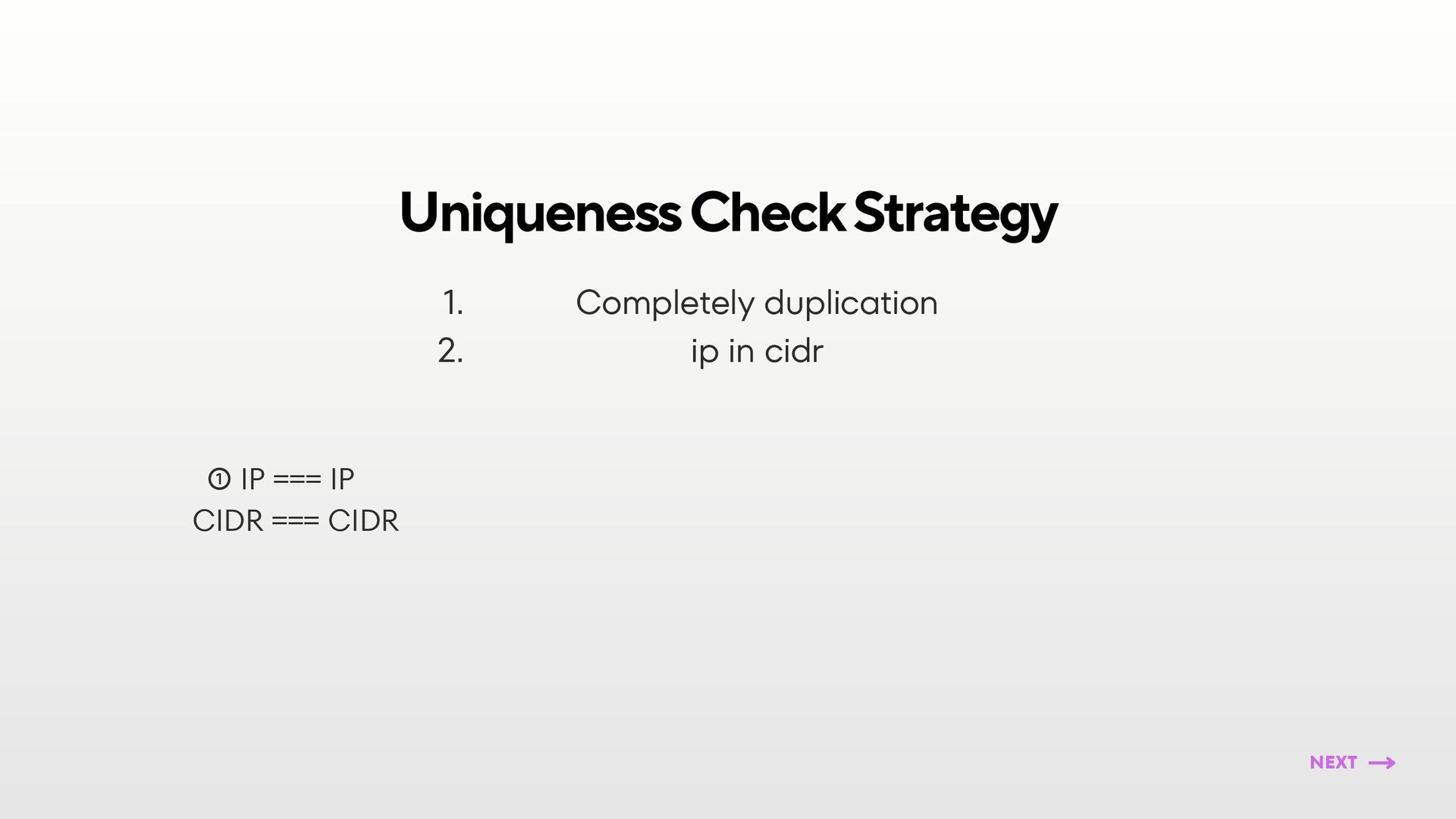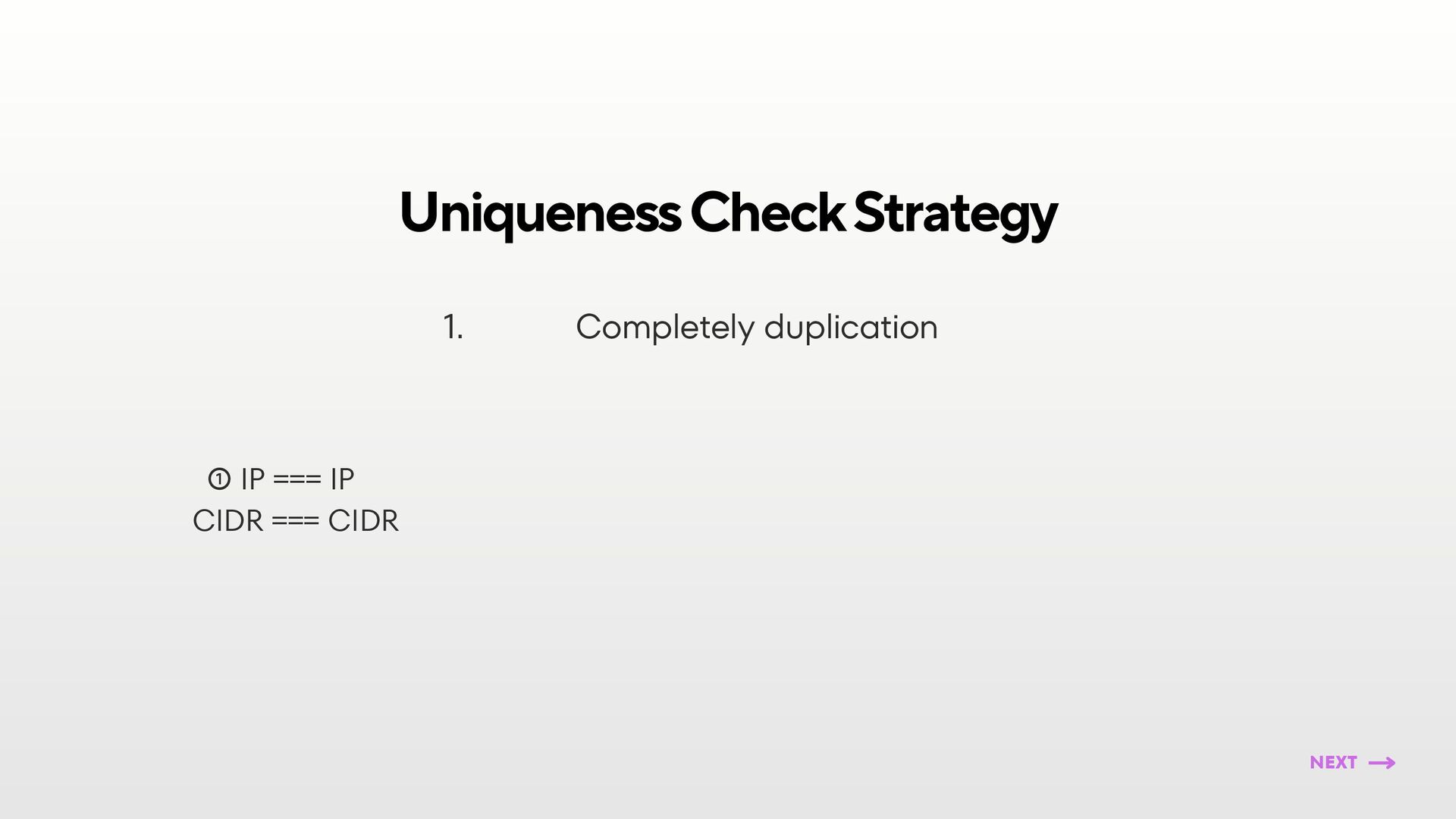 1. Completely duplication 2. ip in cidr Uniqueness Check Strategy