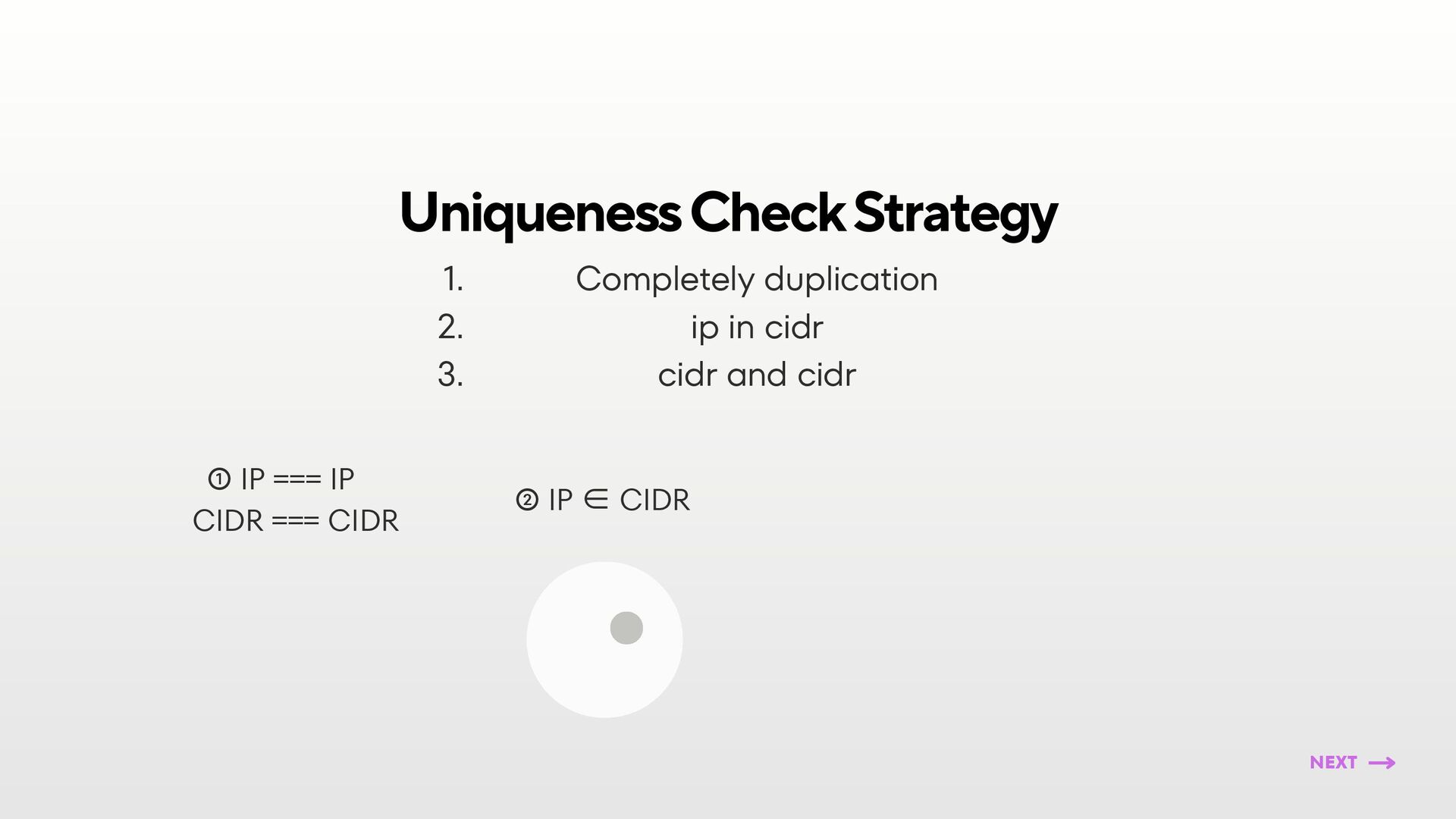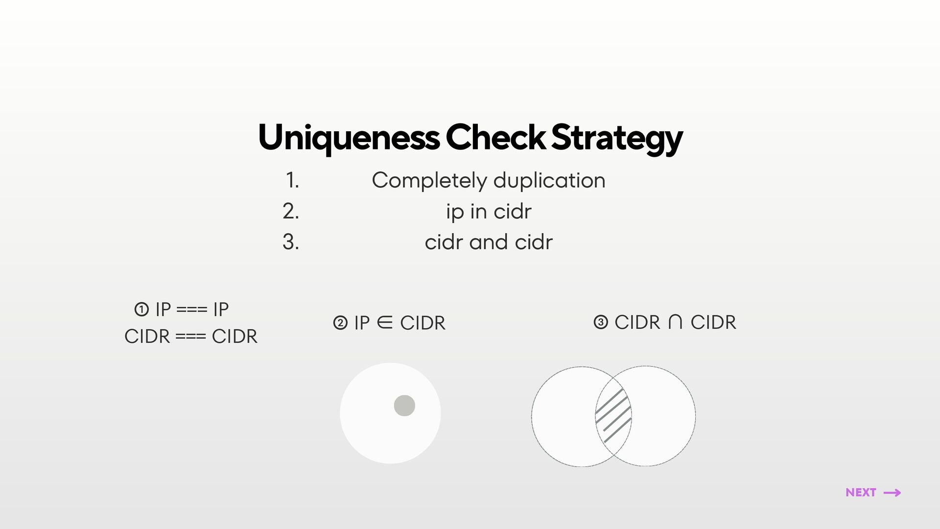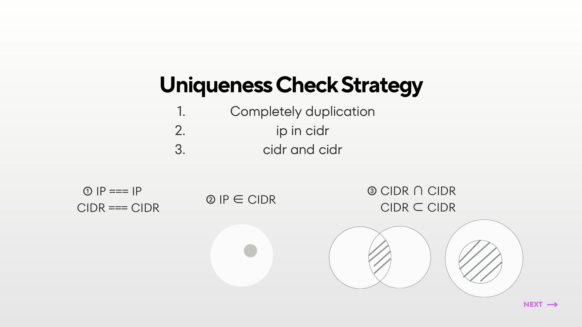 cidr Uniqueness Check Strategy NEXT ① IP === IP CIDR === CIDR ② IP ∈ CIDR ③ CIDR ∩ CIDR CIDR ⊂ CIDR
