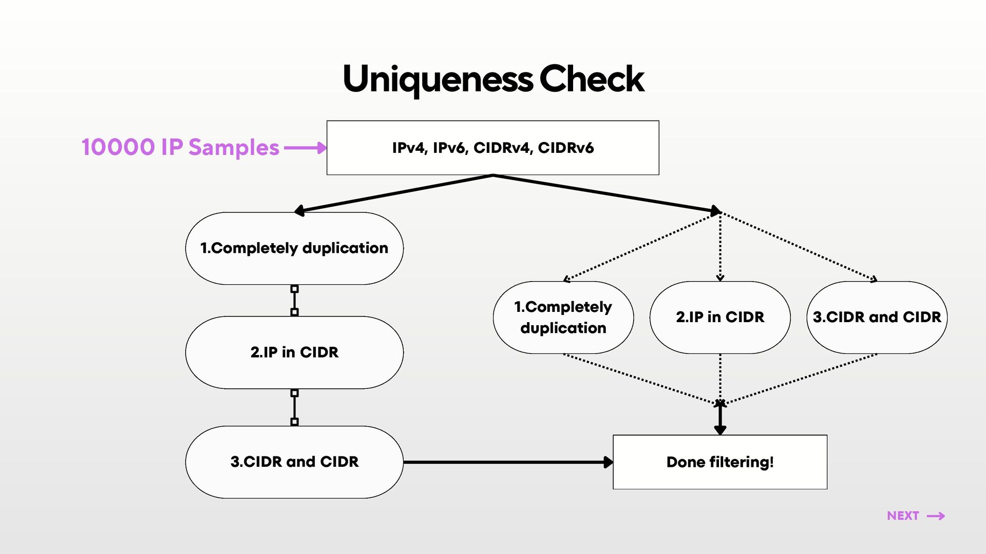 CIDRv4, CIDRv6 1.Completely duplication 2.IP in CIDR 3.CIDR and CIDR Uniqueness Check NEXT Done filtering! 10000 IP Samples