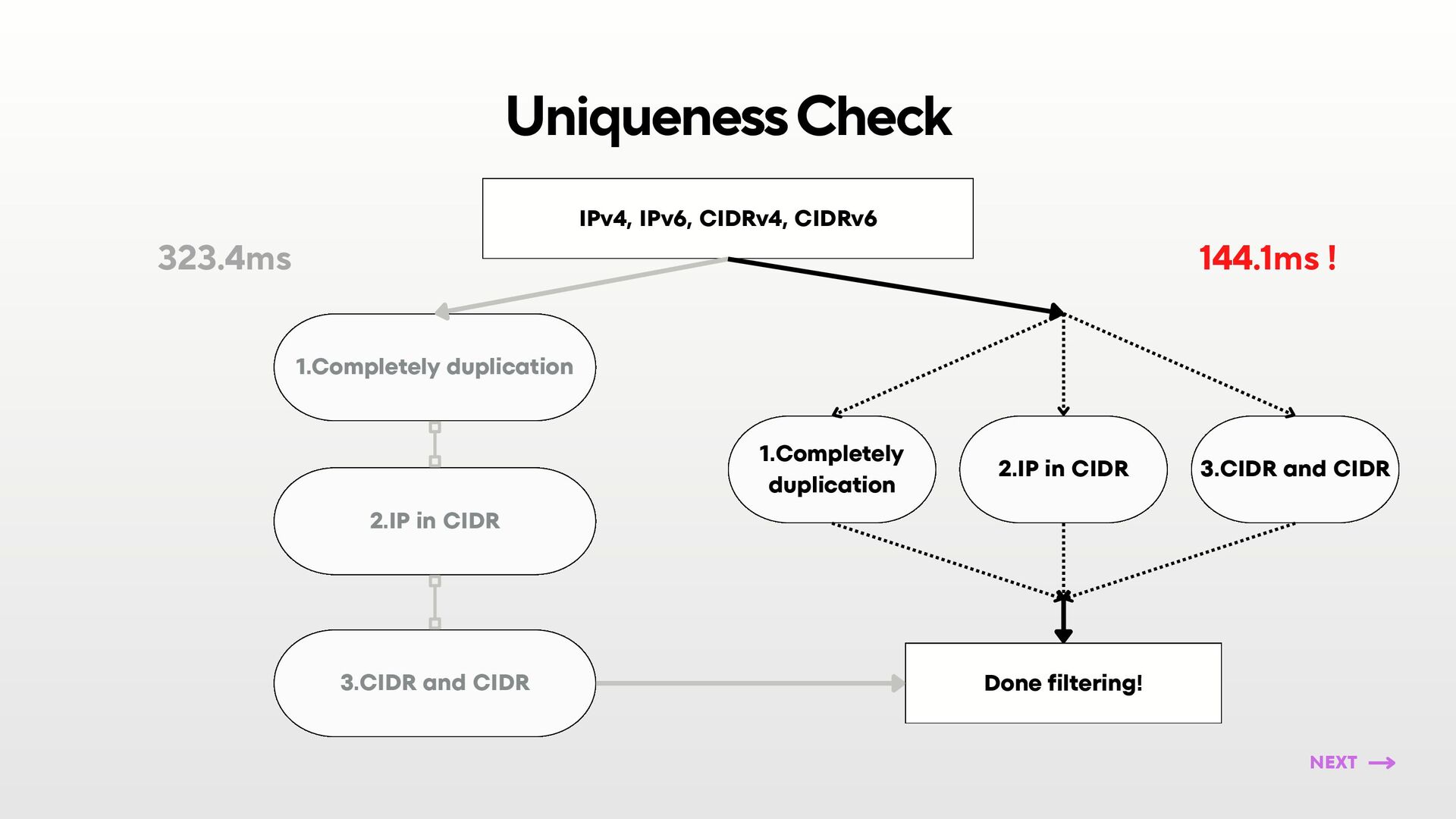 CIDRv4, CIDRv6 1.Completely duplication 2.IP in CIDR 3.CIDR and CIDR Done filtering! Uniqueness Check NEXT 144.1ms ! 323.4ms