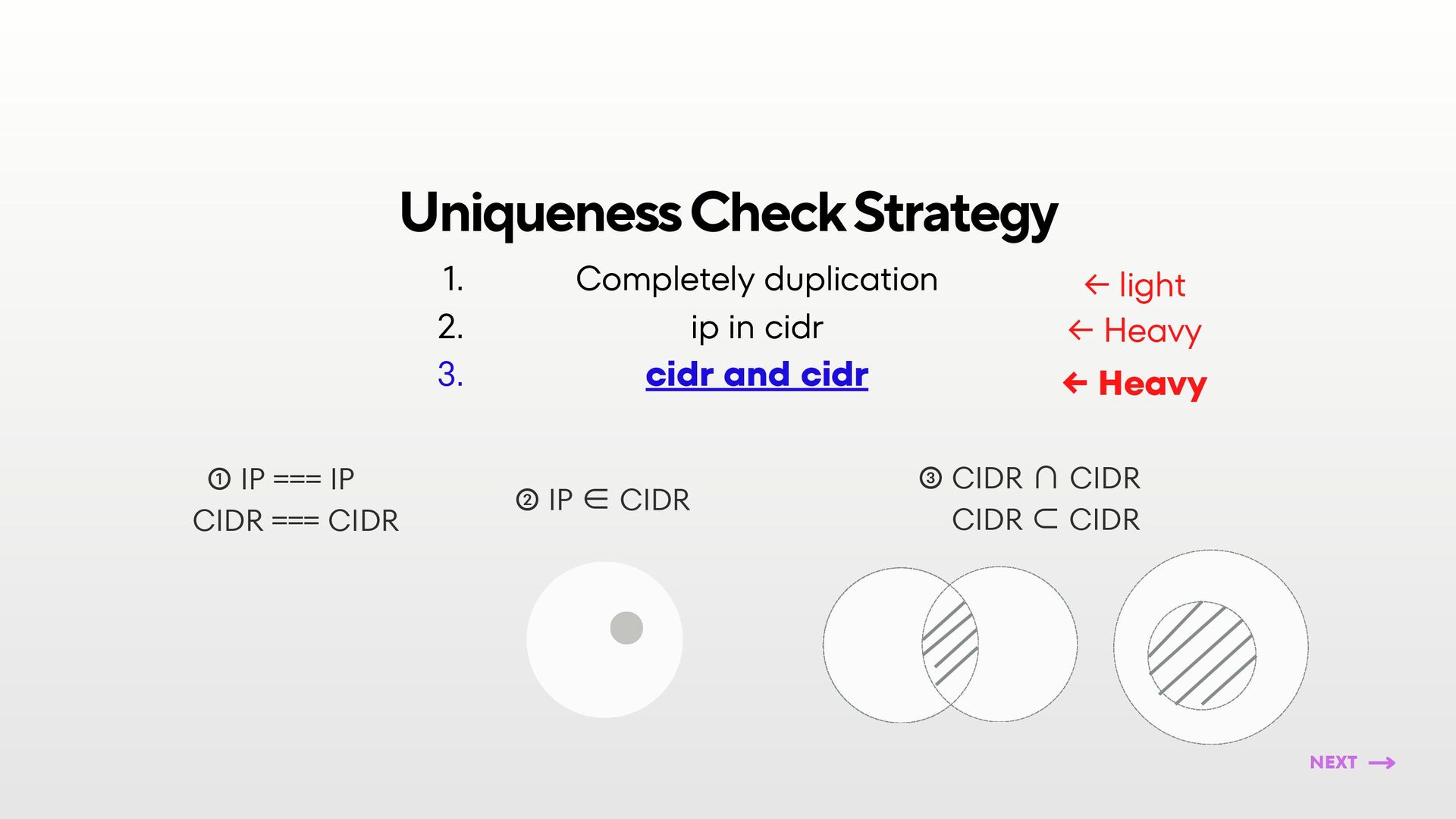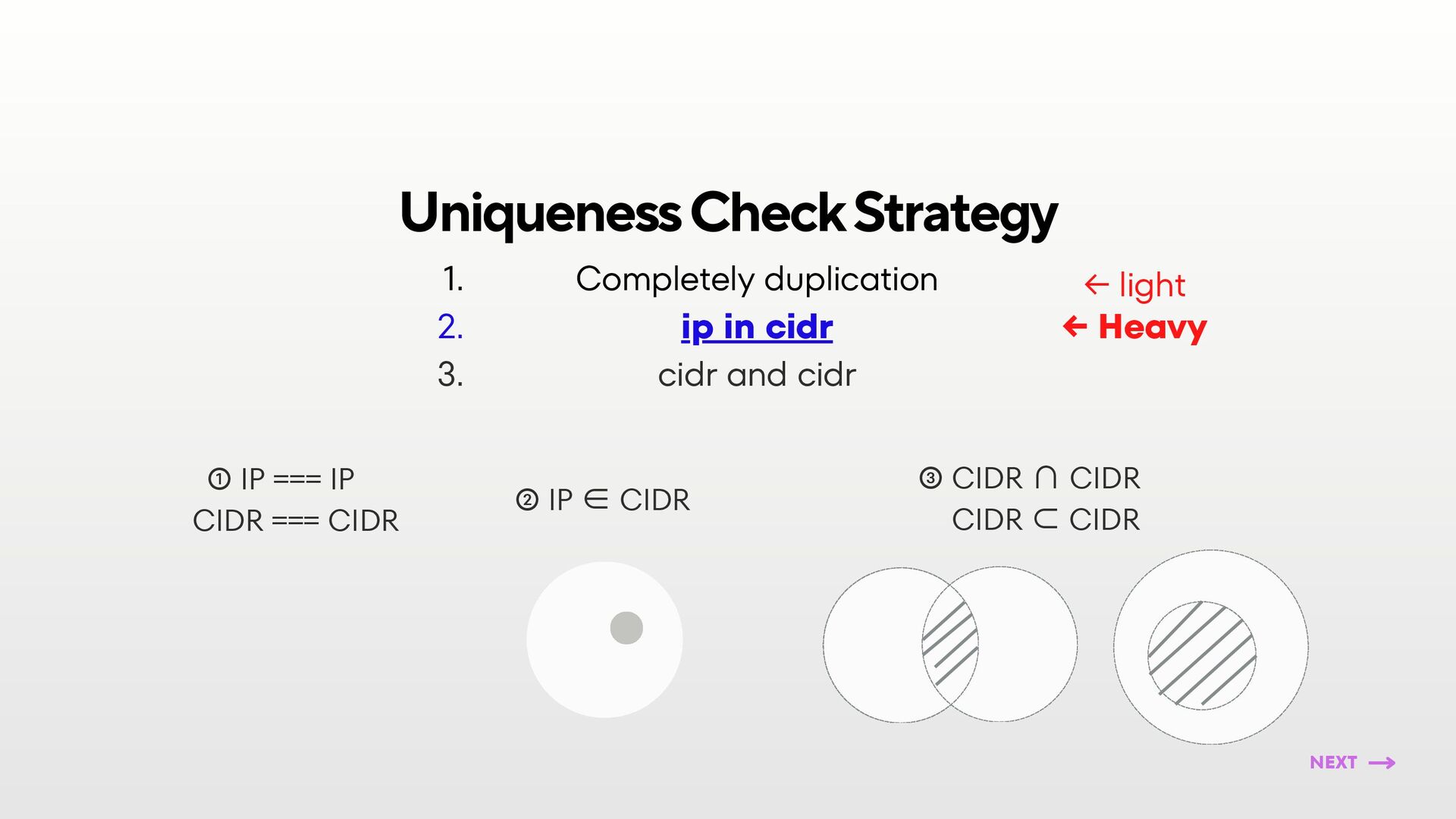 cidr Uniqueness Check Strategy NEXT ① IP === IP CIDR === CIDR ② IP ∈ CIDR ③ CIDR ∩ CIDR CIDR ⊂ CIDR ← light
