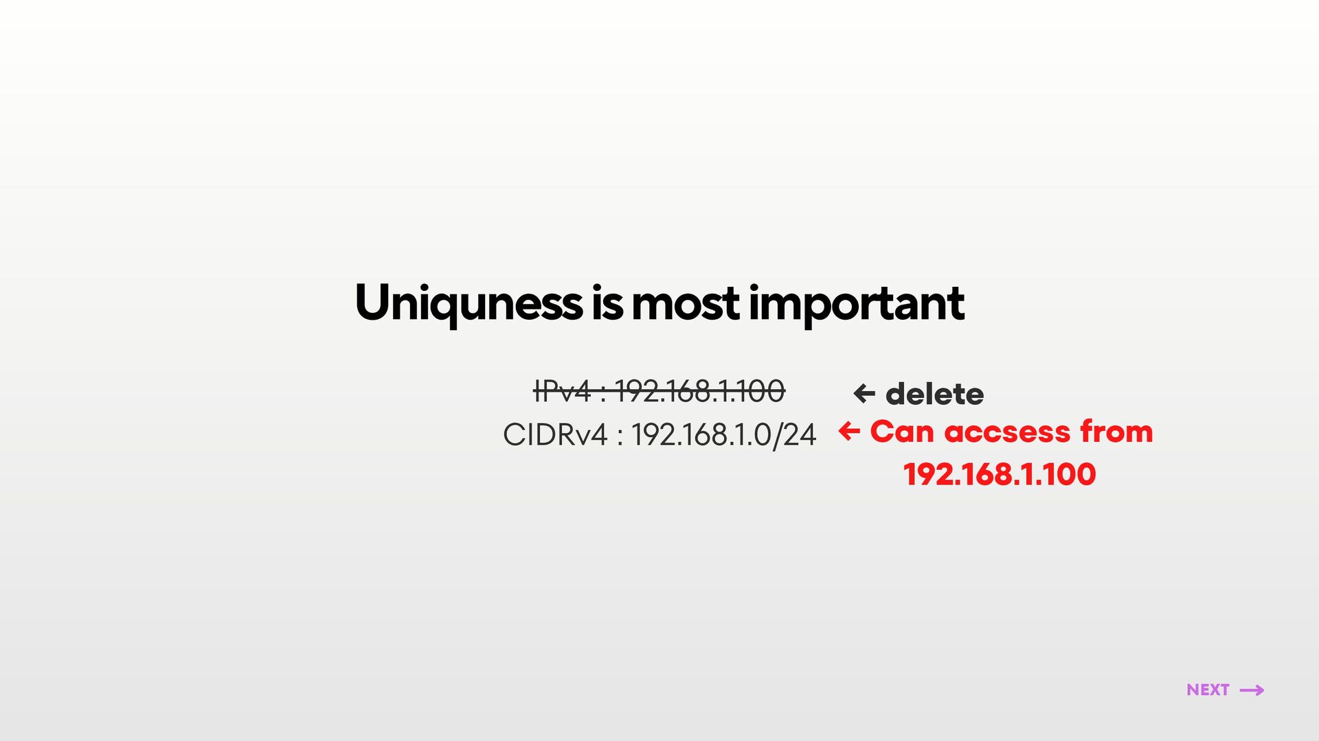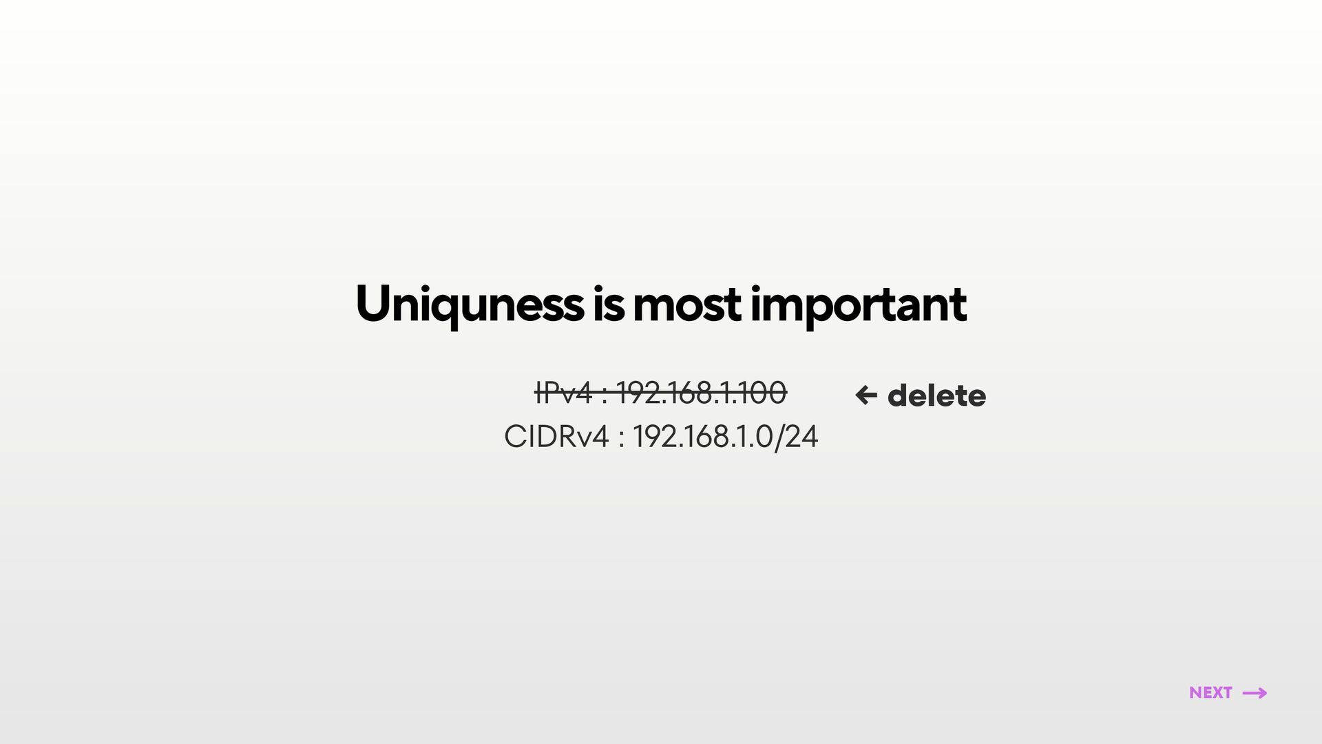 IPv4 : 192.168.1.100 CIDRv4 : 192.168.1.0/24 Uniquness is most important