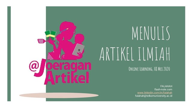 Mencari ide, menginvetarisir ide, mewujudkan ide menjadi tulisan ilmiah 02. Proses kreatif Jenis-jenis publikasi, cara publikasi, tantangan dan hambatan publikasi 03. publikasi Bagaimana agar tetap bisa produktif menulis artikel ilmiah 04. Tips & trick