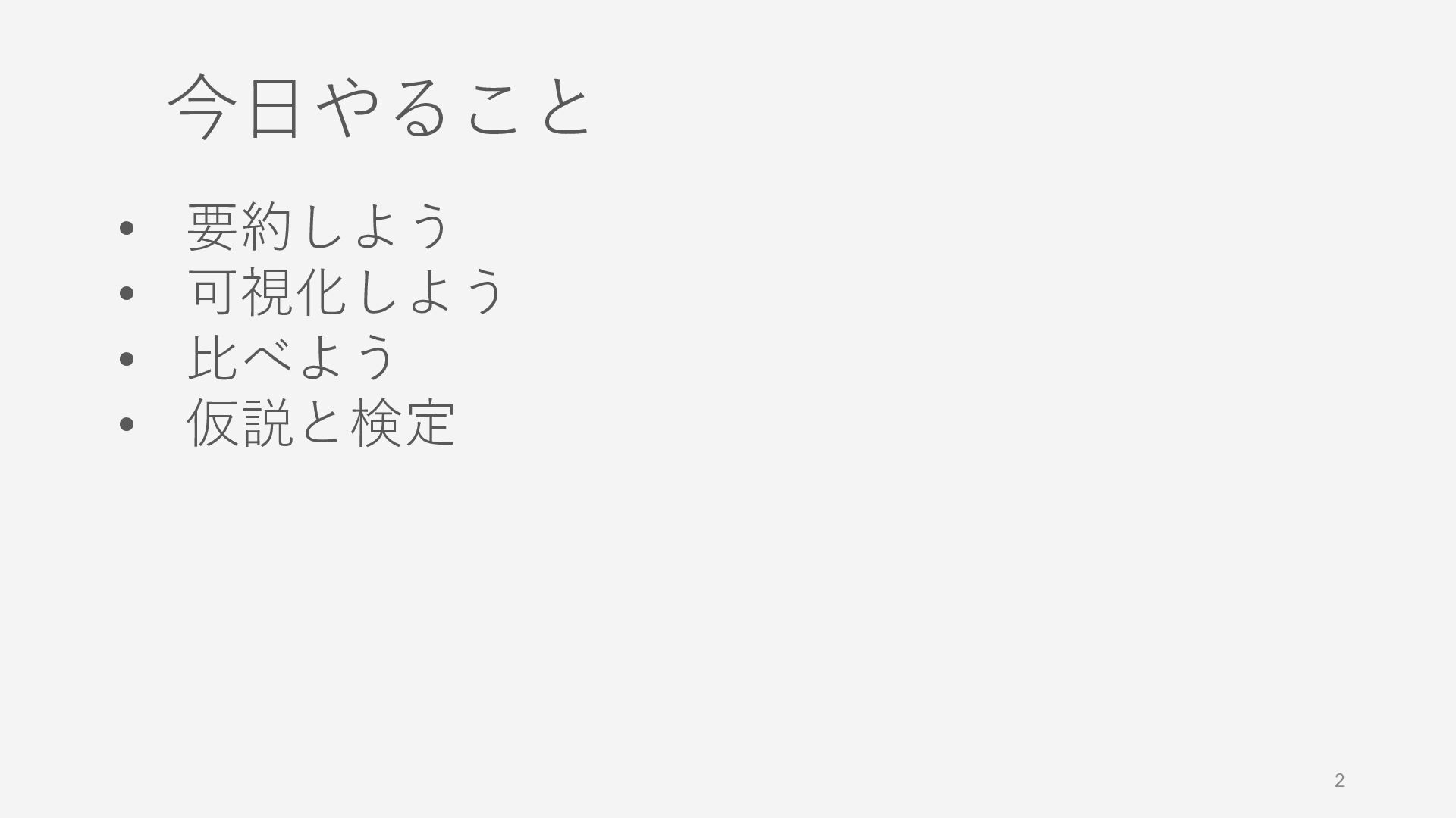 2 今日やること • 要約しよう • 可視化しよう • 比べよう • 仮説と検定