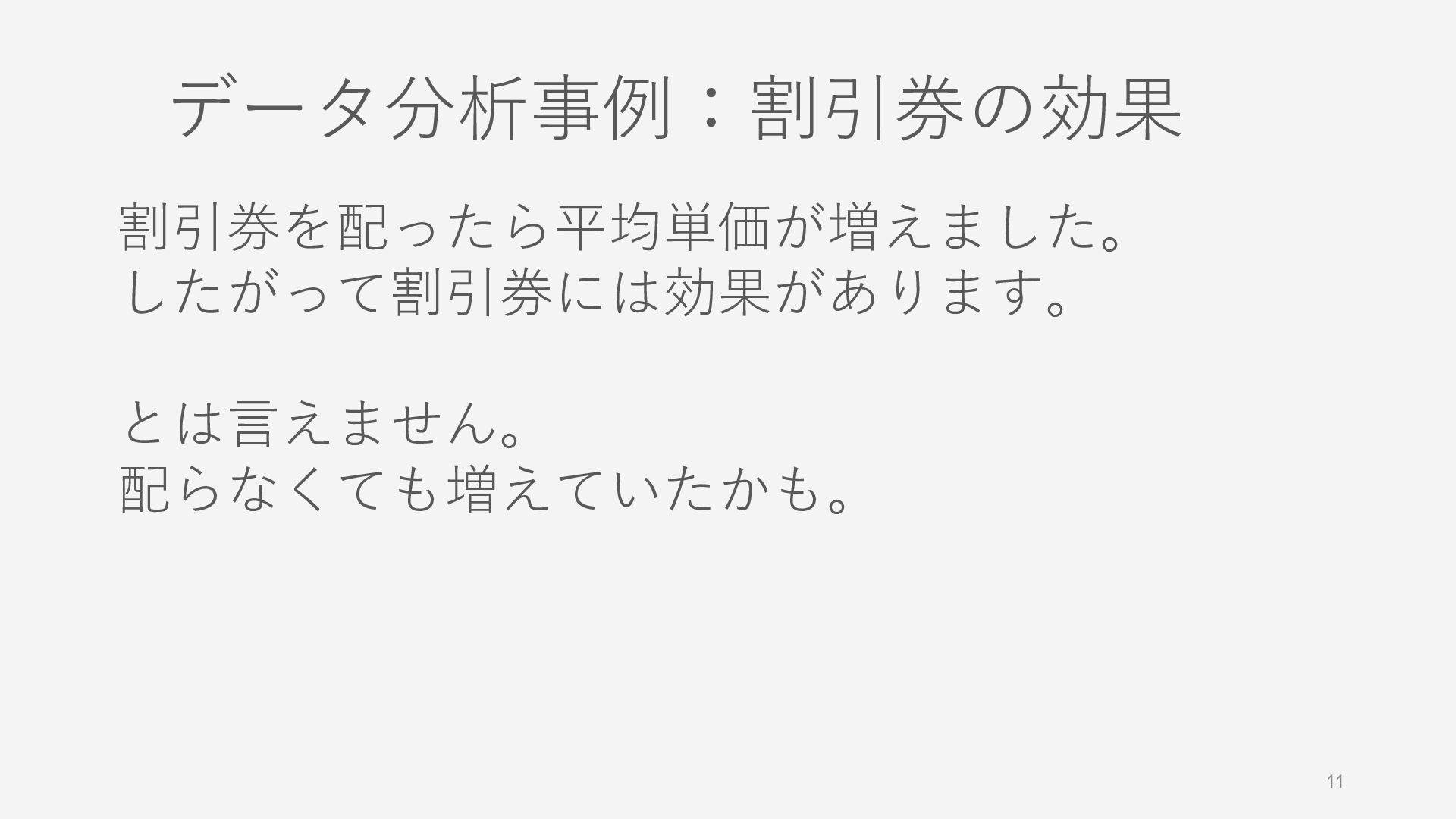 11 データ分析事例:割引券の効果 割引券を配ったら平均単価が増えました。 したがって割引券には効果があります。 とは言えません。 配らなくても増えていたかも。