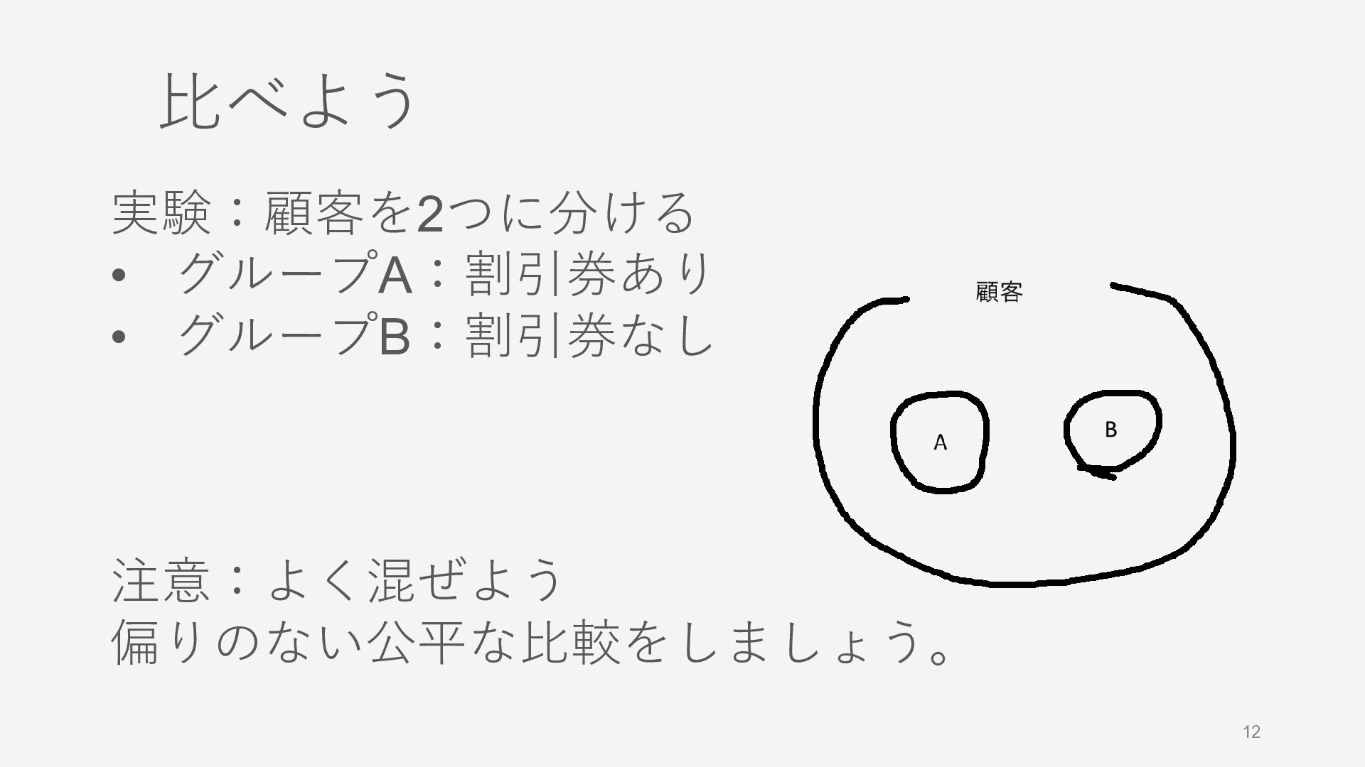 12 比べよう 実験:顧客を2つに分ける • グループA:割引券あり • グループB:割引券なし 注意:よく混ぜよう 偏りのない公平な比較をしましょう。