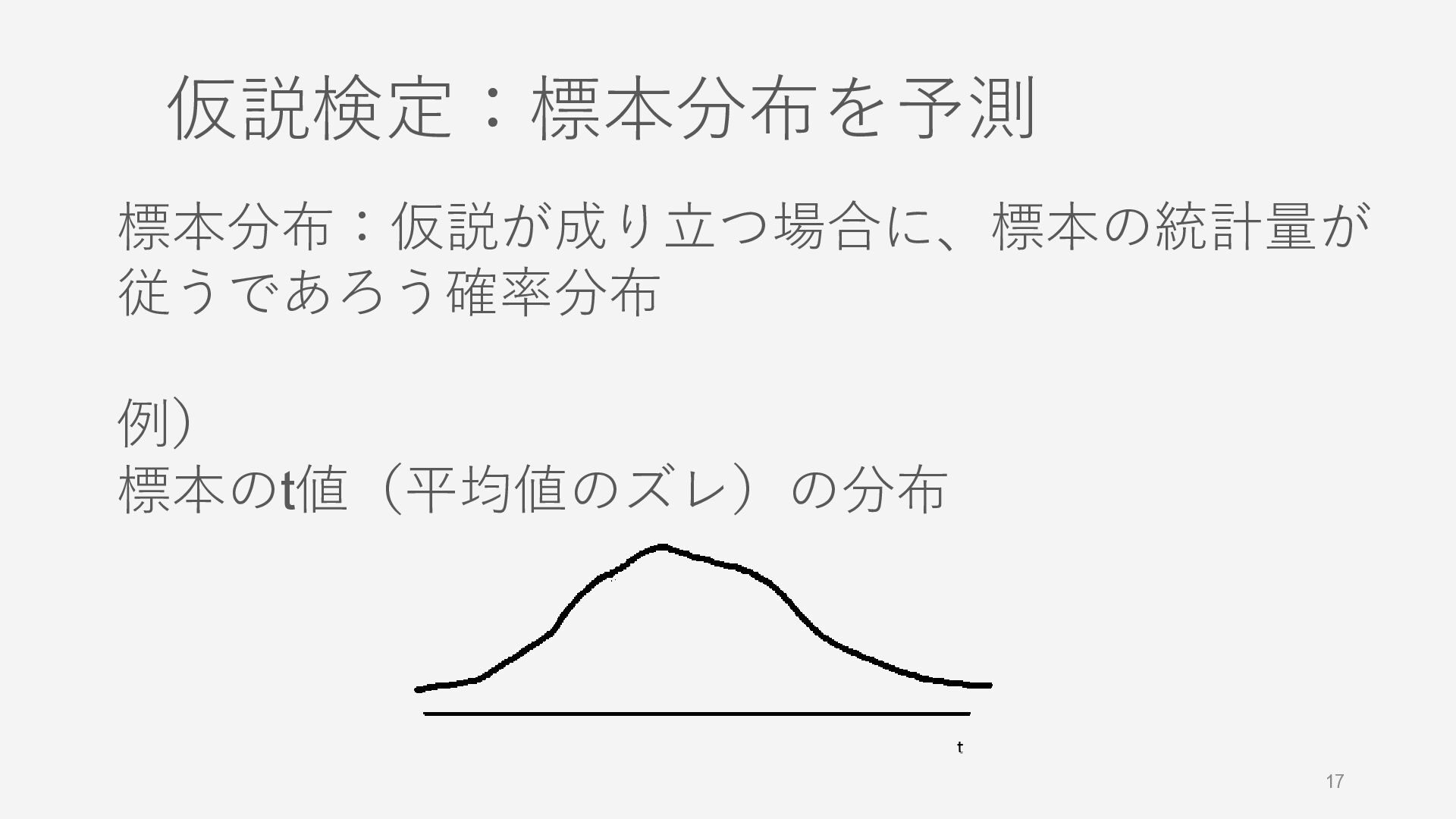 17 仮説検定:標本分布を予測 標本分布:仮説が成り立つ場合に、標本の統計量が 従うであろう確率分布 例) 標本のt値(平均値のズレ)の分布