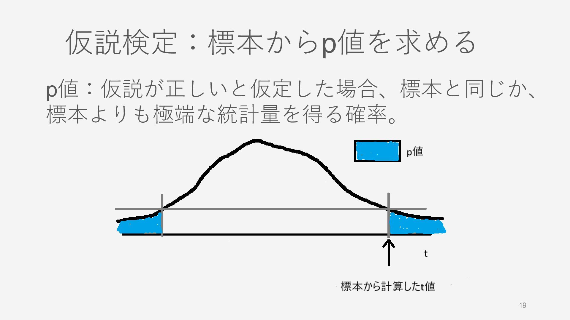 19 仮説検定:標本からp値を求める p値:仮説が正しいと仮定した場合、標本と同じか、 標本よりも極端な統計量を得る確率。