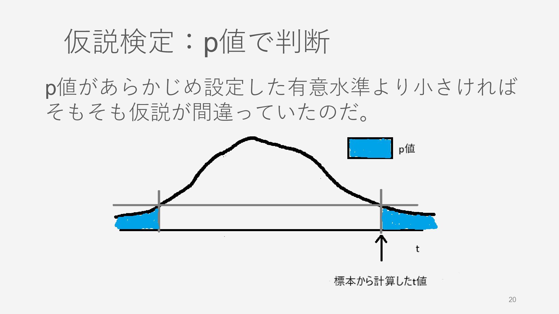 20 仮説検定:p値で判断 p値があらかじめ設定した有意水準より小さければ そもそも仮説が間違っていたのだ。
