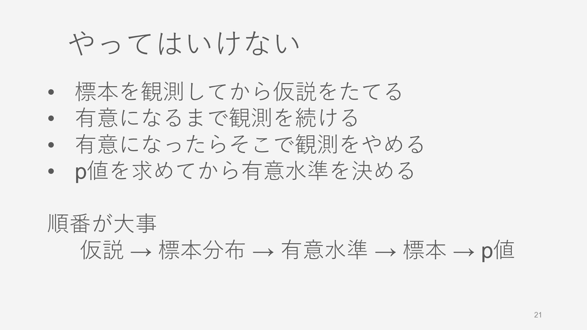 21 やってはいけない • 標本を観測してから仮説をたてる • 有意になるまで観測を続ける • 有意になったらそこで観測をやめる • p値を求めてから有意水準を決める