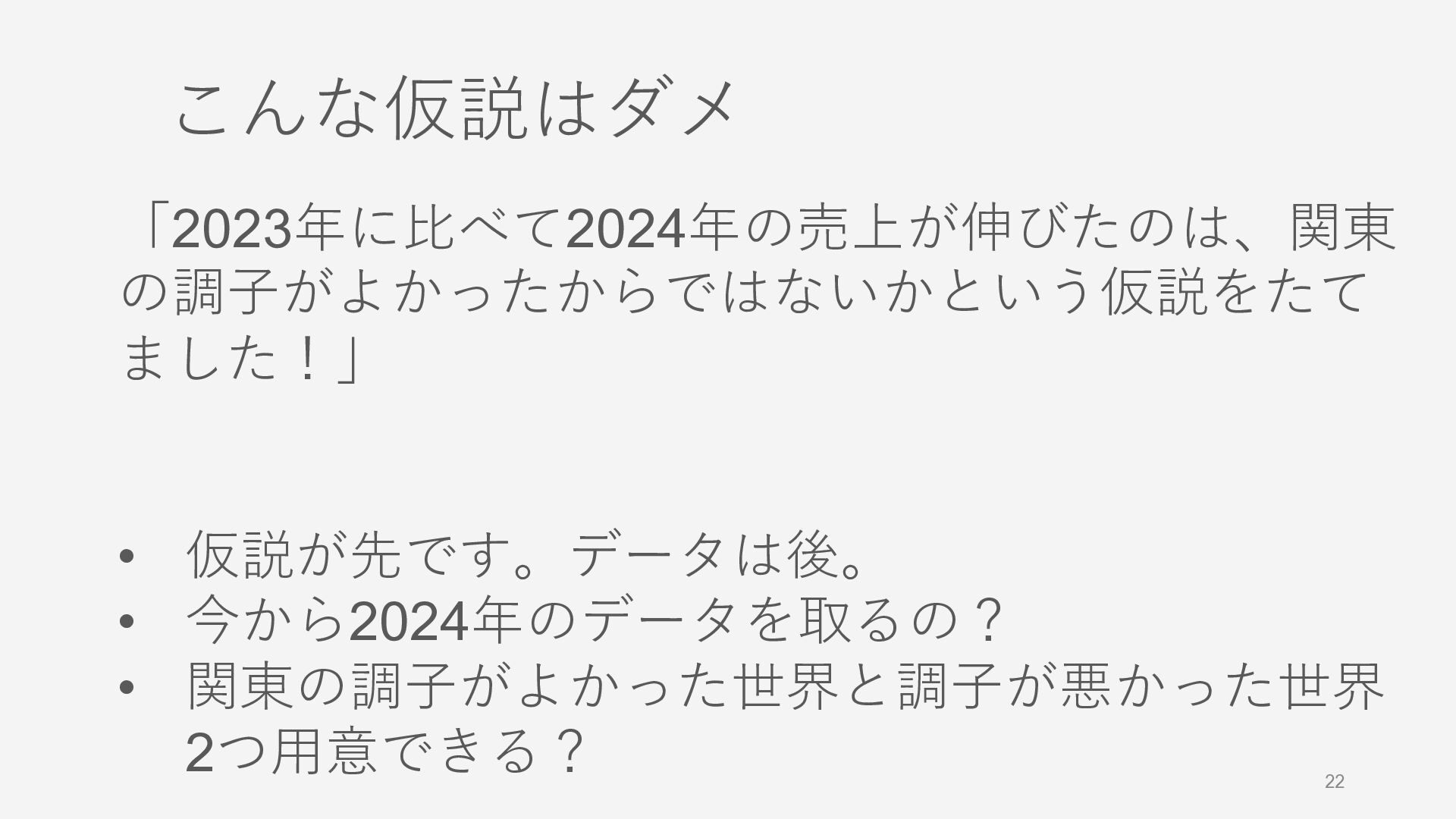 22 こんな仮説はダメ 「2023年に比べて2024年の売上が伸びたのは、関東 の調子がよかったからではないかという仮説をたて ました!」 • 仮説が先です。データは後。 • 今から2024年のデータを取るの? •