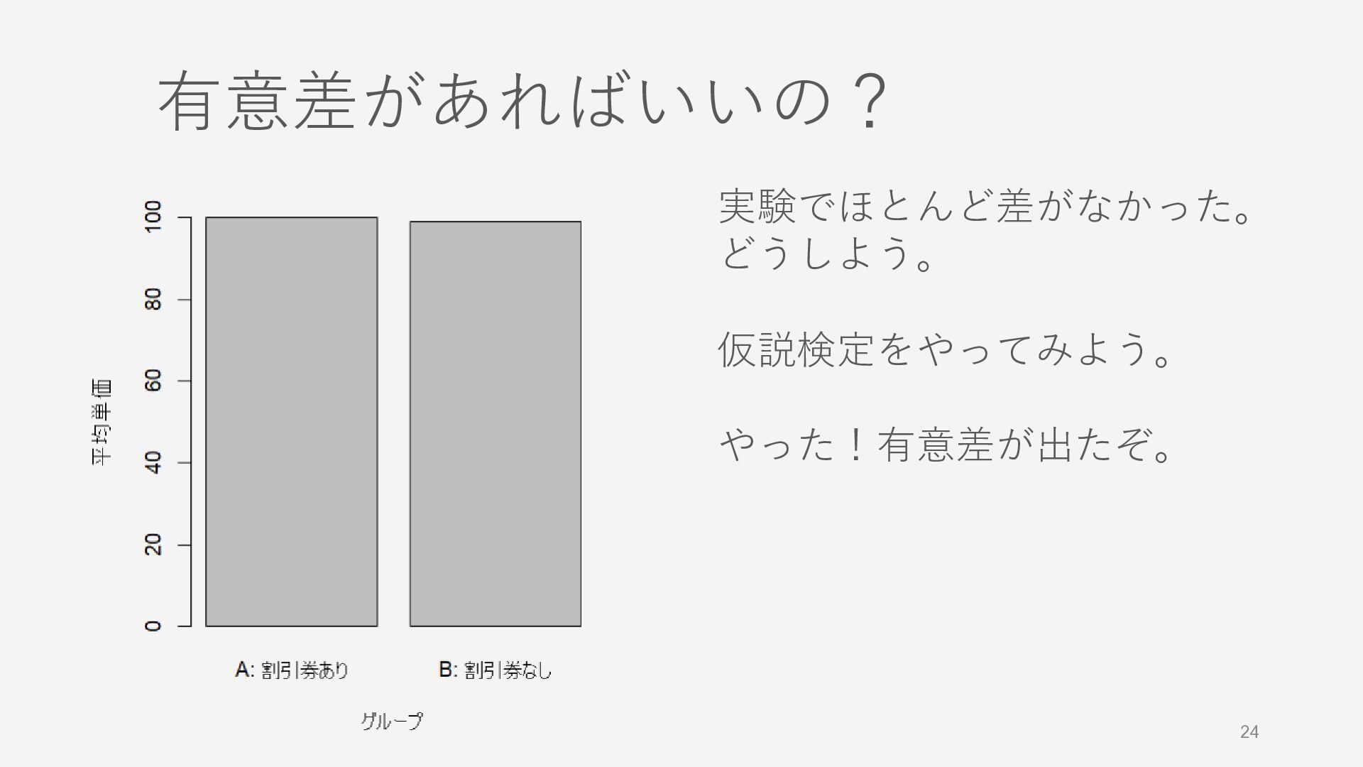 24 有意差があればいいの? 実験でほとんど差がなかった。 どうしよう。 仮説検定をやってみよう。 やった!有意差が出たぞ。