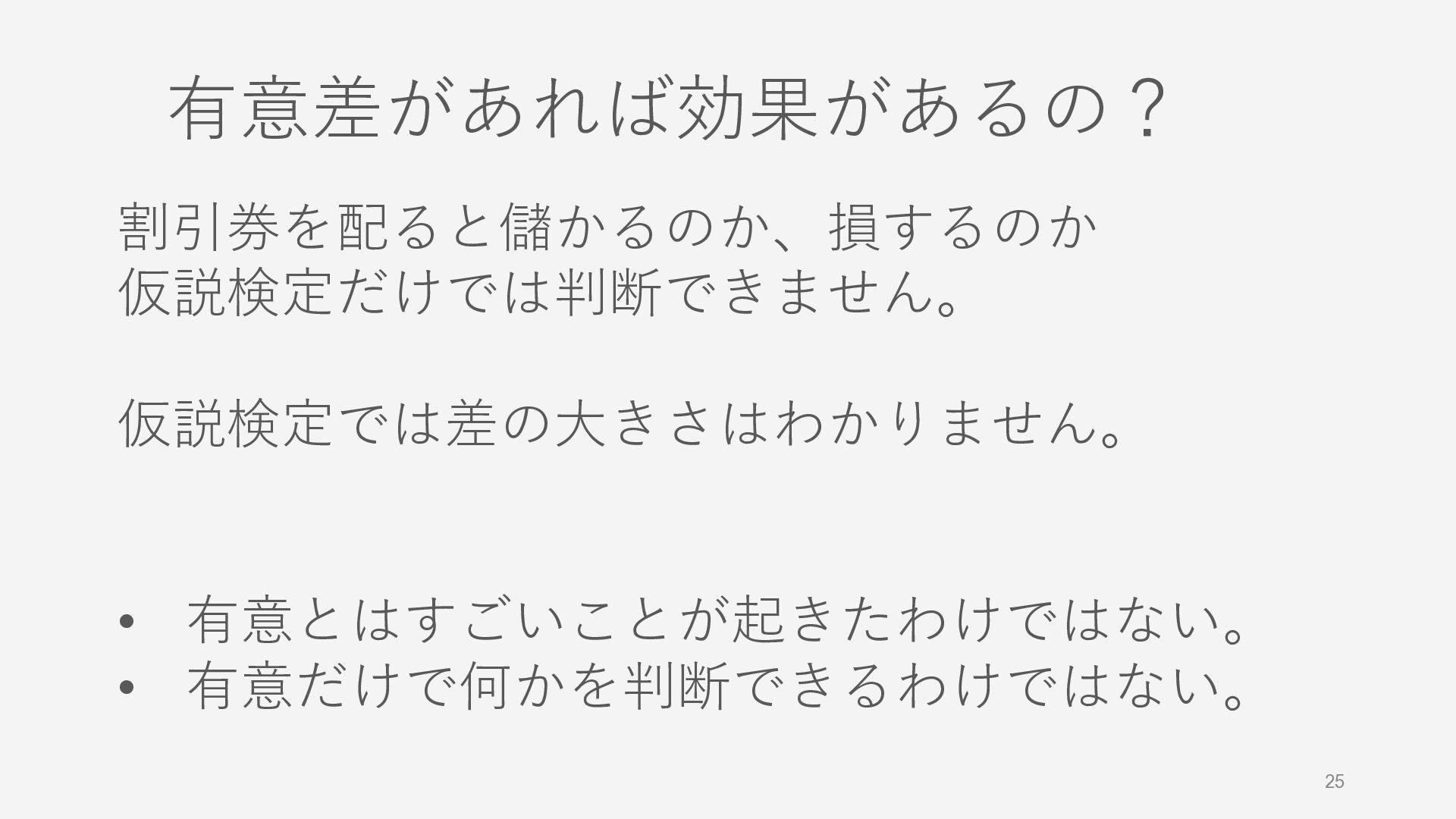 25 有意差があれば効果があるの? 割引券を配ると儲かるのか、損するのか 仮説検定だけでは判断できません。 仮説検定では差の大きさはわかりません。 • 有意とはすごいことが起きたわけではない。 • 有意だけで何かを判断できるわけではない。