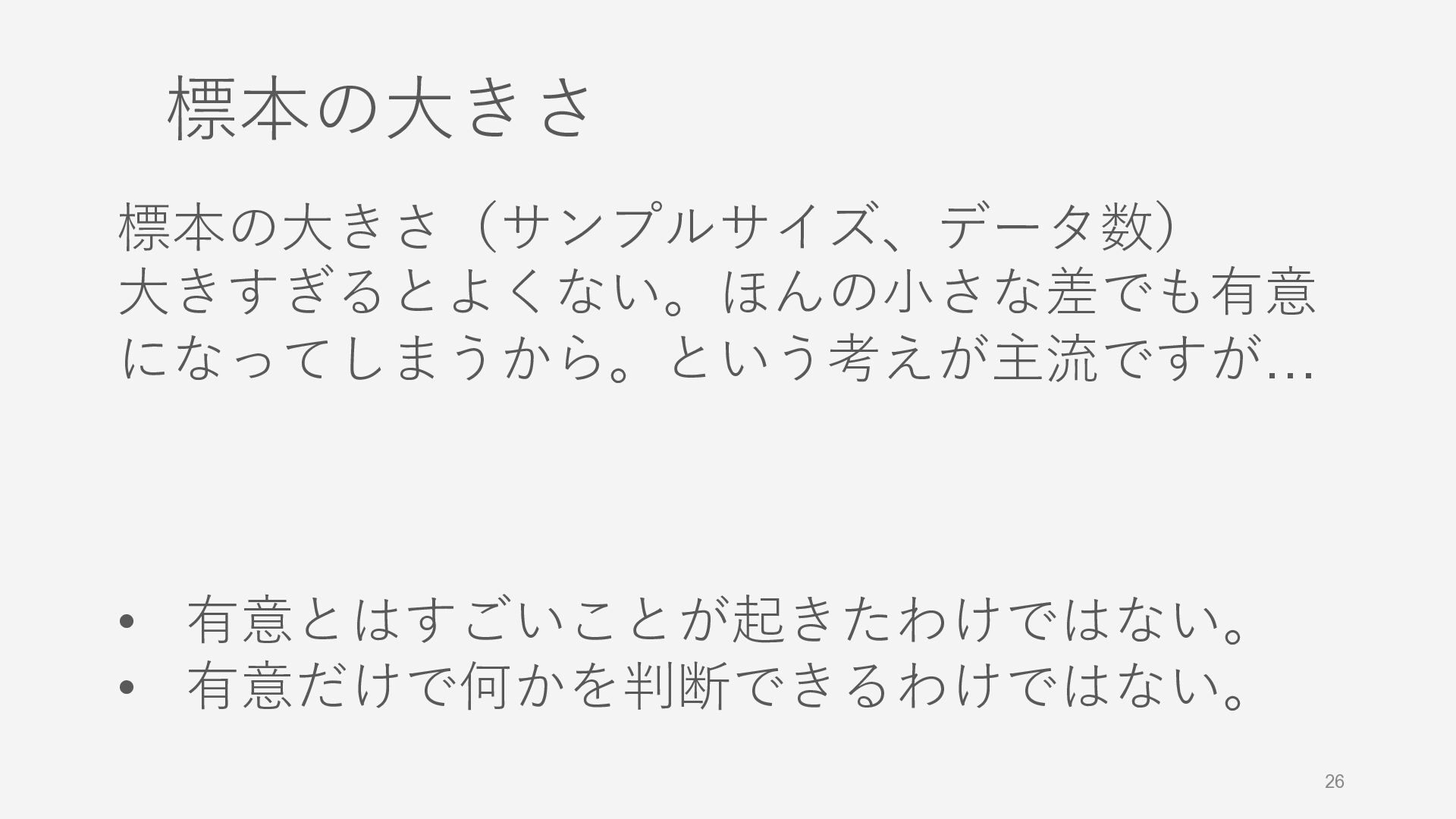 26 標本の大きさ 標本の大きさ(サンプルサイズ、データ数) 大きすぎるとよくない。ほんの小さな差でも有意 になってしまうから。という考えが主流ですが… • 有意とはすごいことが起きたわけではない。 • 有意だけで何かを判断できるわけではない。