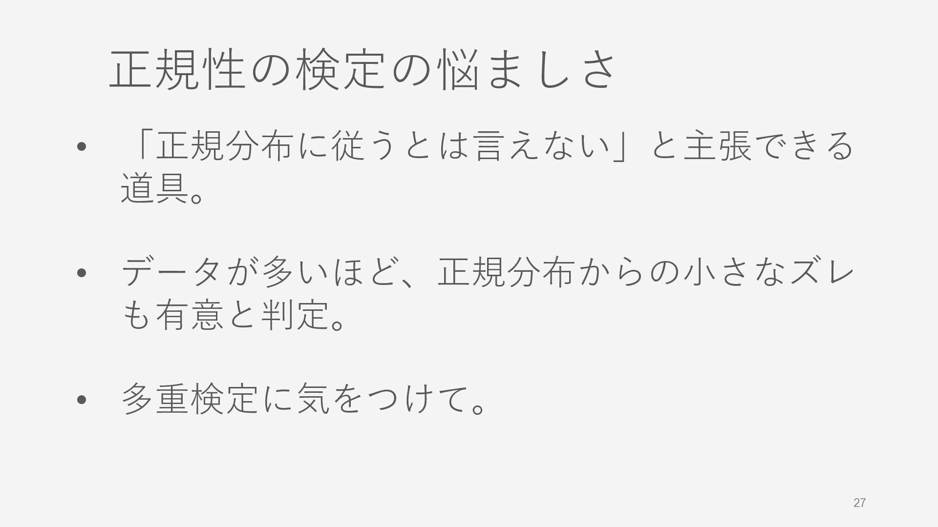 27 正規性の検定の悩ましさ • 「正規分布に従うとは言えない」と主張できる 道具。 • データが多いほど、正規分布からの小さなズレ も有意と判定。 • 多重検定に気をつけて。