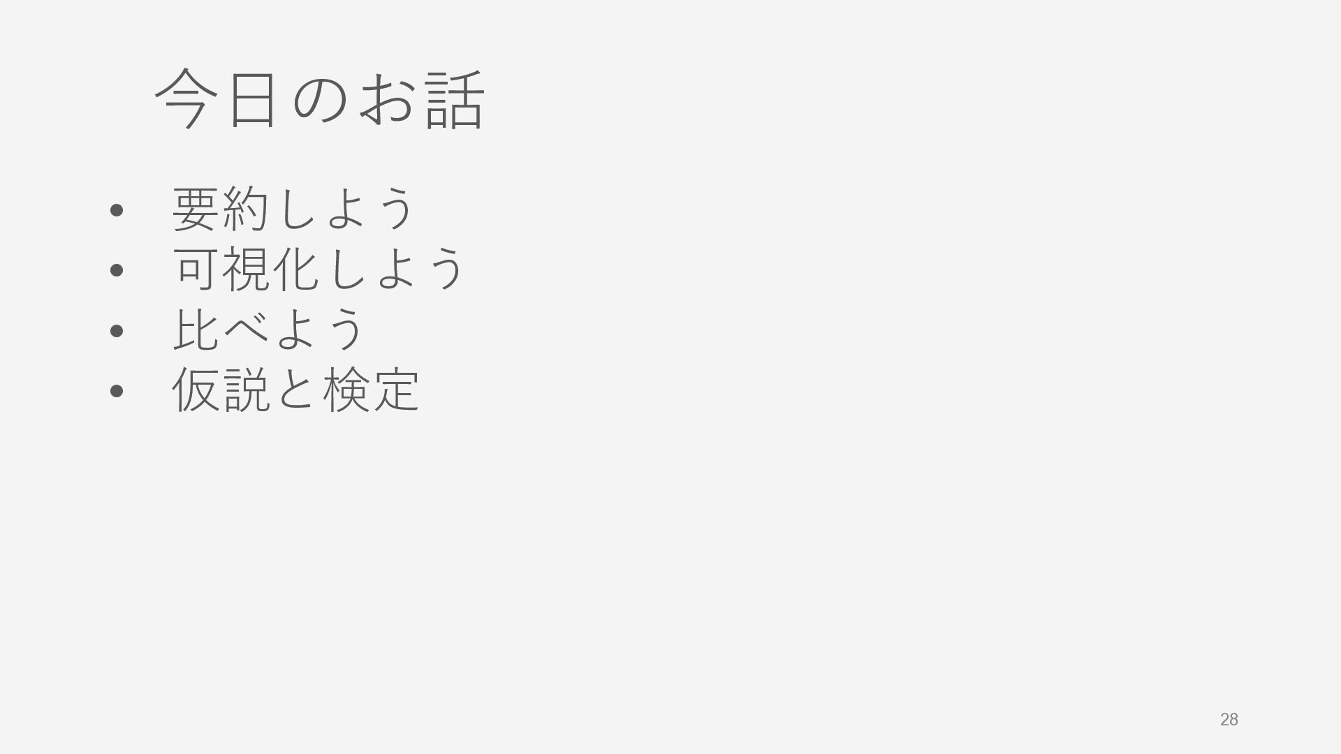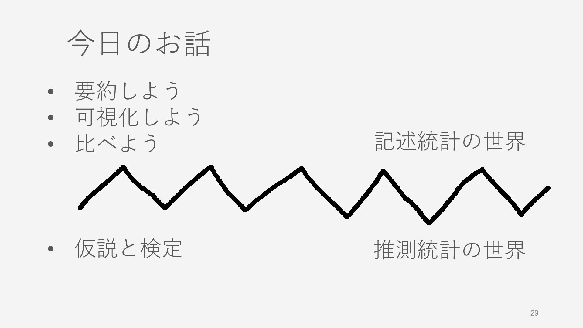 28 今日のお話 • 要約しよう • 可視化しよう • 比べよう • 仮説と検定