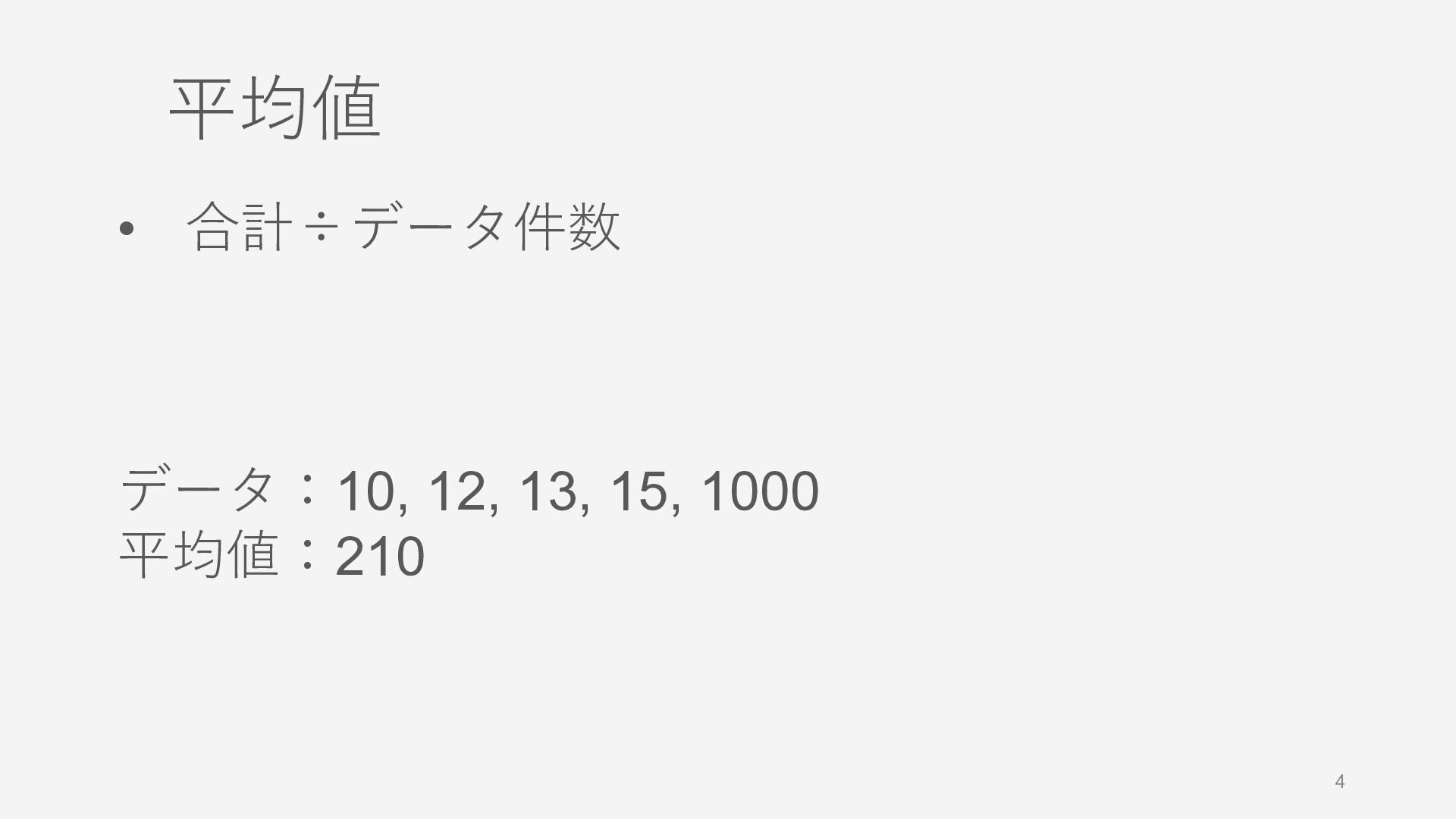 3 要約しよう • データはそのままだとわかりにくい • 一言で説明したい データ:10, 12, 13, 15,