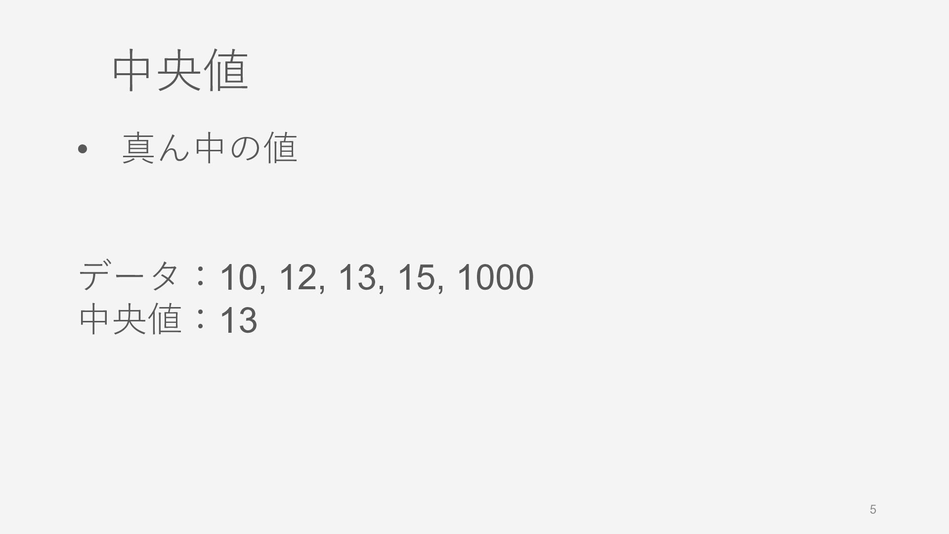 5 中央値 • 真ん中の値 データ:10, 12, 13, 15, 1000 中央値:13