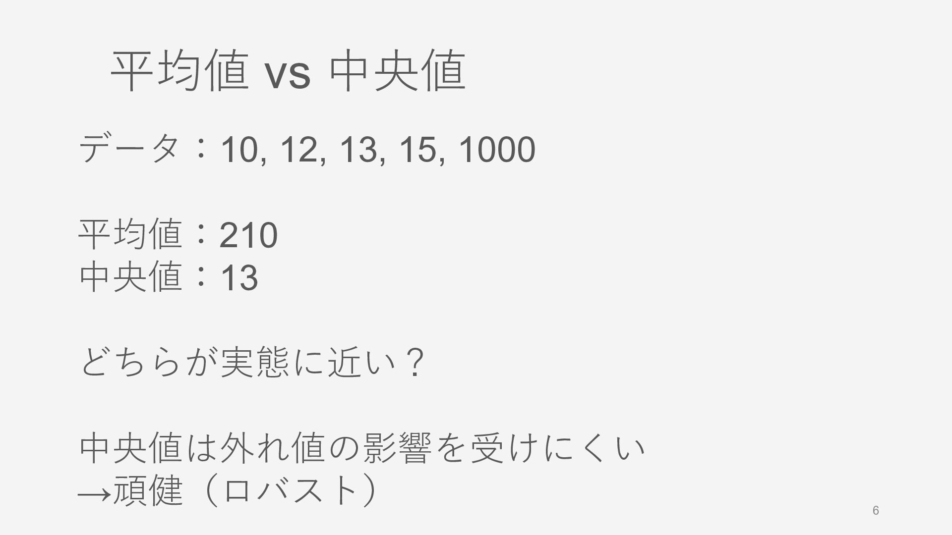 6 平均値 vs 中央値 データ:10, 12, 13, 15, 1000 平均値:210