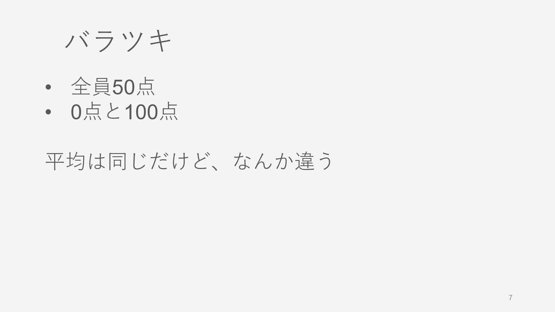 7 バラツキ • 全員50点 • 0点と100点 平均は同じだけど、なんか違う