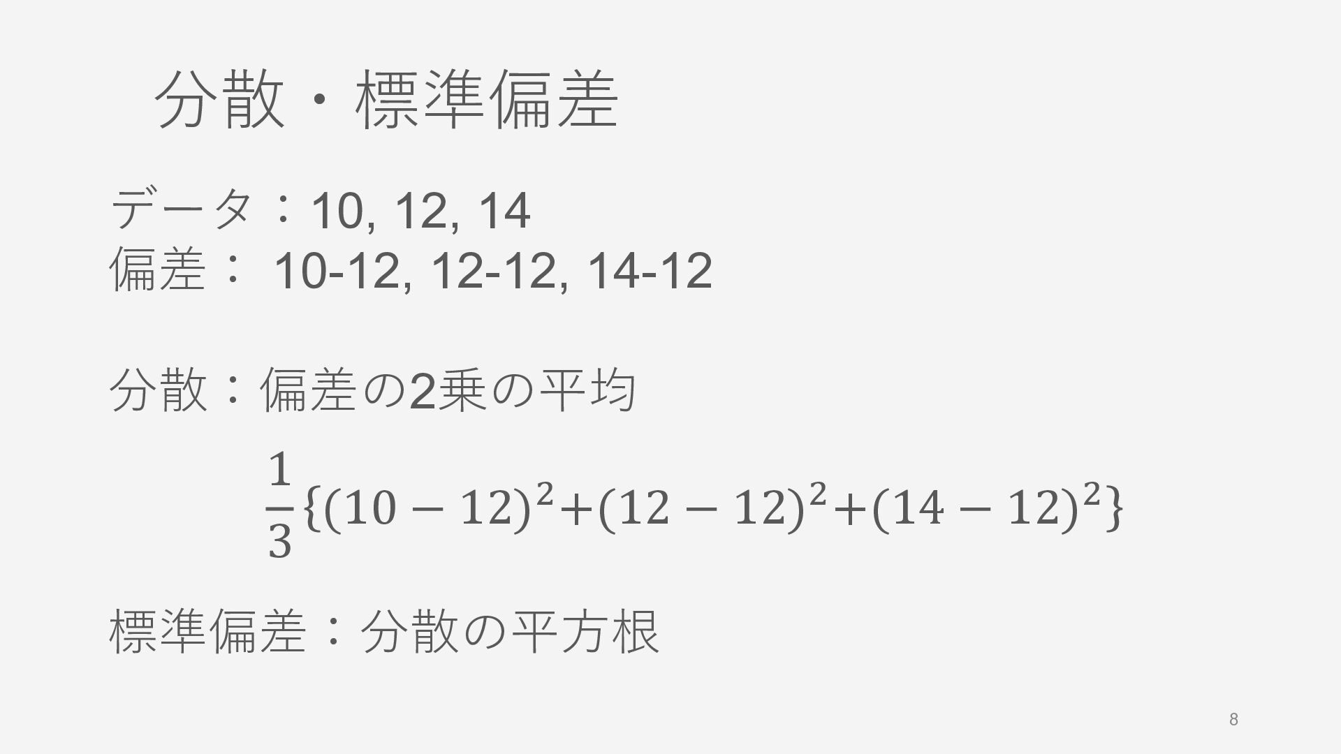 8 分散・標準偏差 データ:10, 12, 14 偏差: 10-12, 12-12, 14-12 分散:偏差の2乗の平均