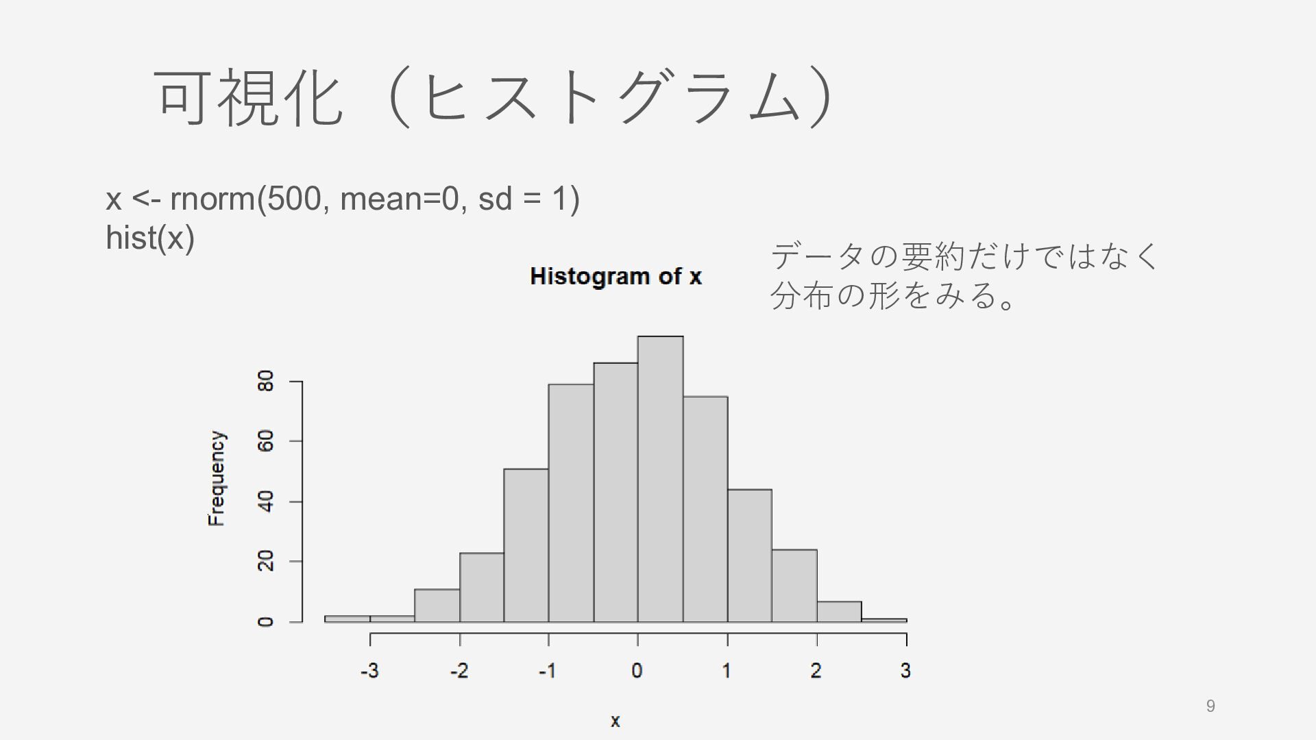9 可視化(ヒストグラム) x <- rnorm(500, mean=0, sd = 1) hist(x)