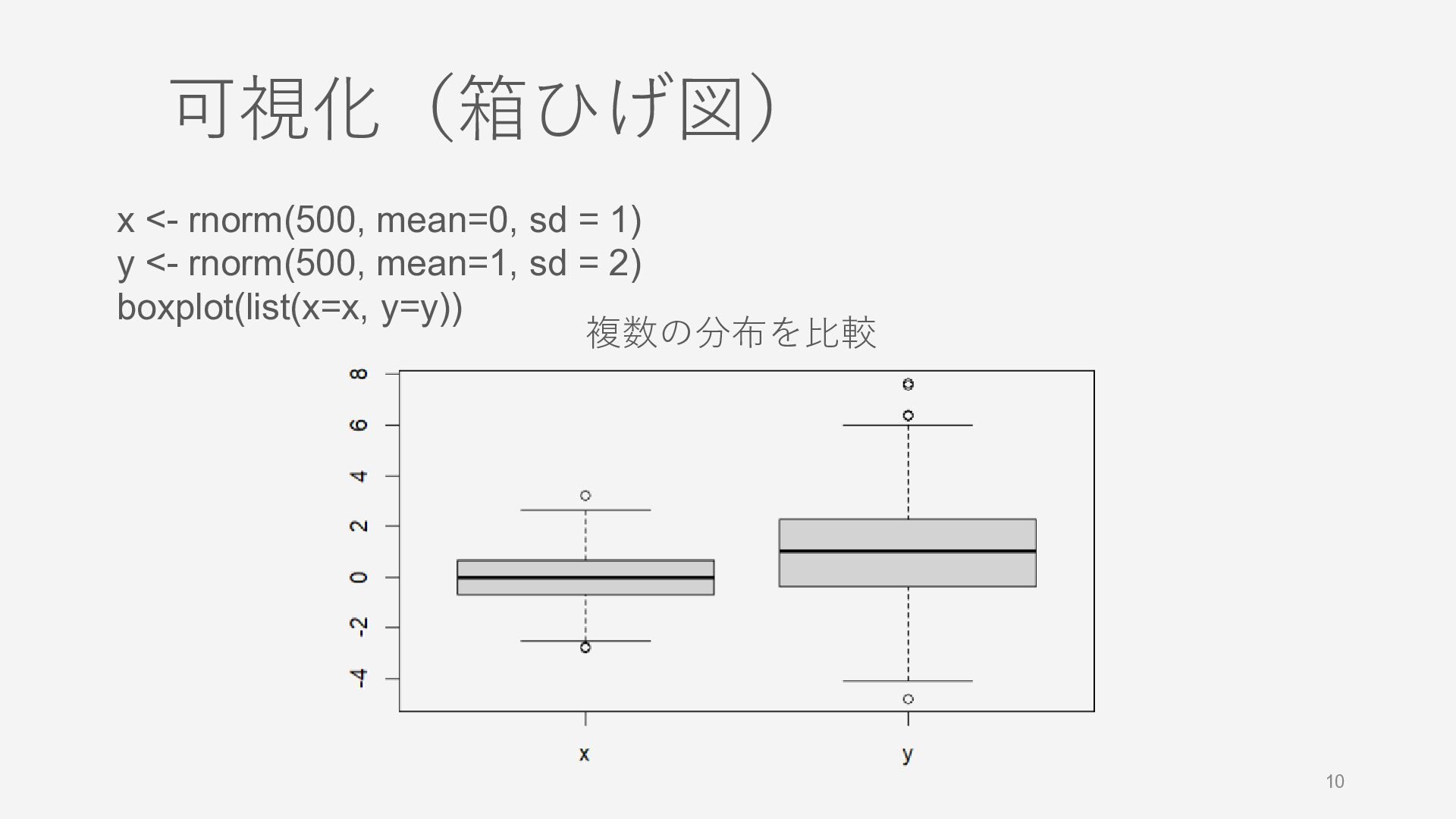 10 可視化(箱ひげ図) x <- rnorm(500, mean=0, sd = 1) y