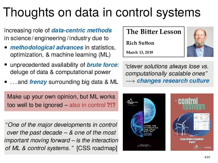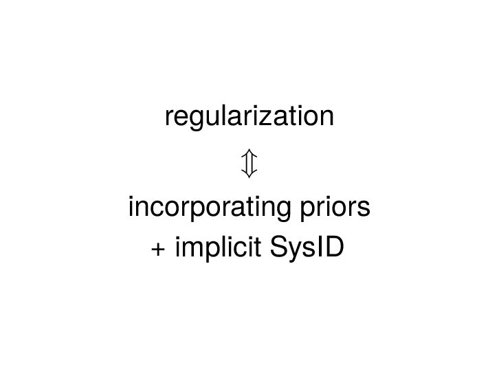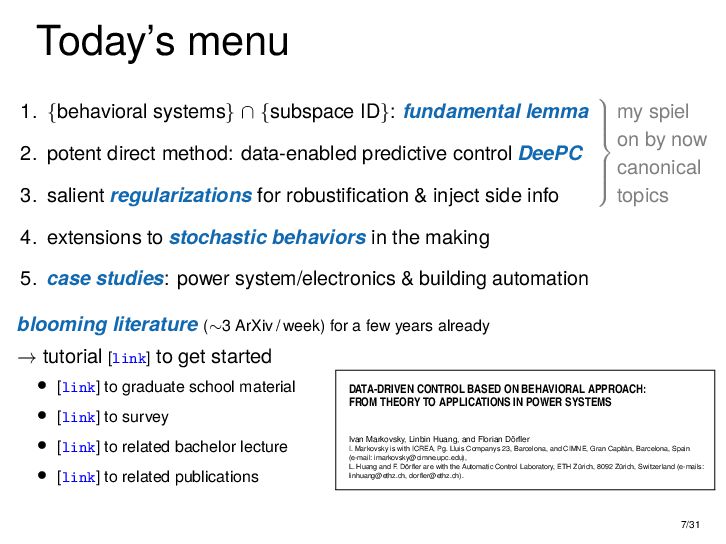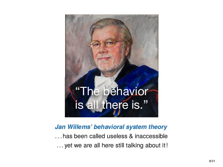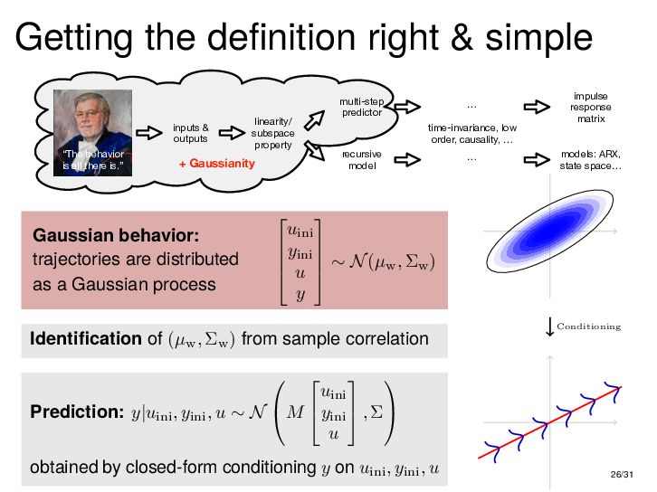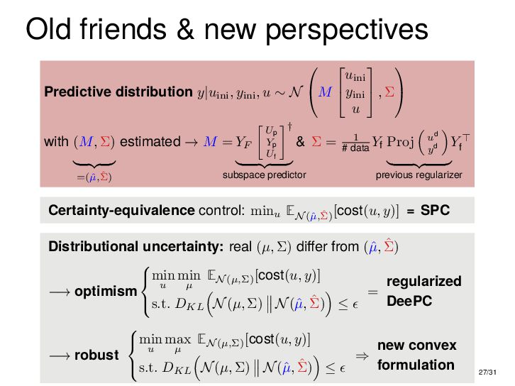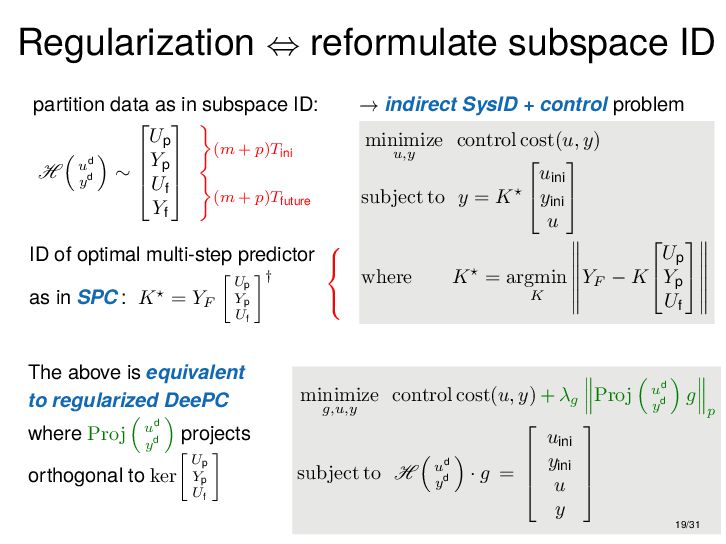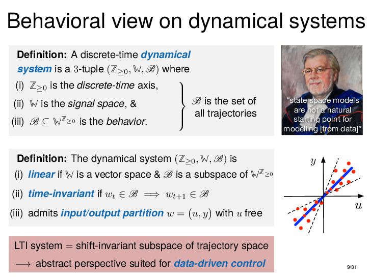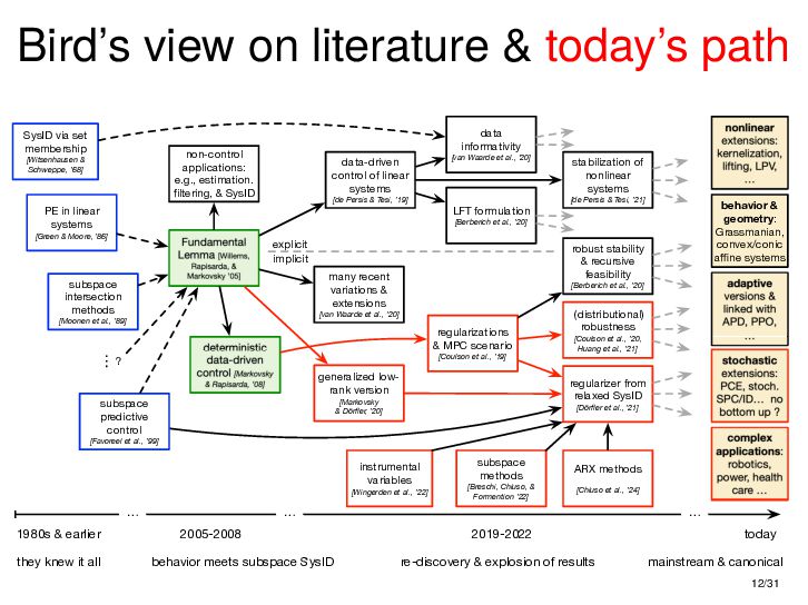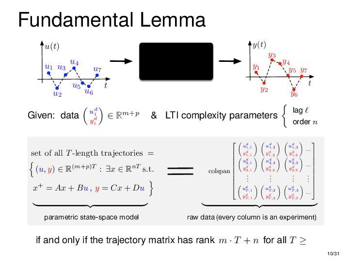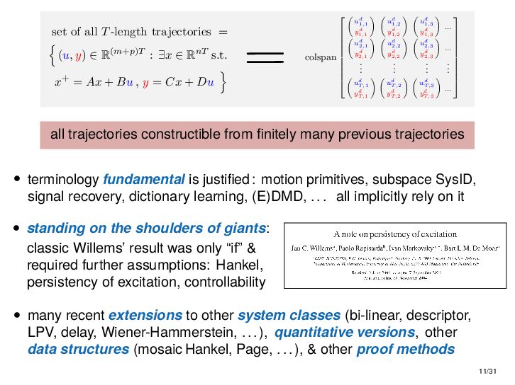 : ∃x ∈ RnT s.t. x+ = Ax + Bu , y = Cx + Du parametric state-space model non-parametric model from raw data colspan ud 1,1 yd 1,1 ud 1,2 yd 1,2 ud 1,3 yd 1,3 ... ud 2,1 yd 2,1 ud 2,2 yd 2,2 ud 2,3 yd 2,3 ... . . . . . . . . . . . . ud T,1 yd T,1 ud T,2 yd T,2 ud T,3 yd T,3 ... all trajectories constructible from finitely many previous trajectories • terminology fundamental is justified : motion primitives, subspace SysID, signal recovery, dictionary learning, (E)DMD, ... all implicitly rely on it • standing on the shoulders of giants: classic Willems’ result was only “if” & required further assumptions: Hankel, persistency of excitation, controllability • many recent extensions to other system classes (bi-linear, descriptor, LPV, delay, Wiener-Hammerstein, ...), quantitative versions, other data structures (mosaic Hankel, Page, ...), & other proof methods 11/31