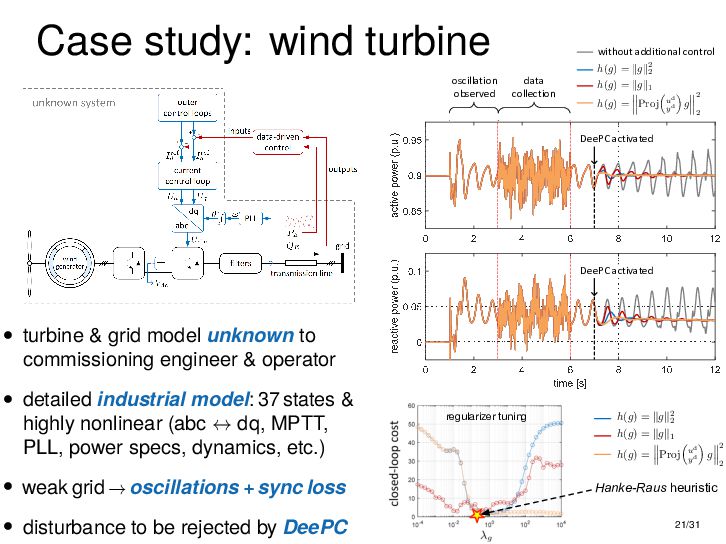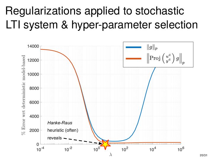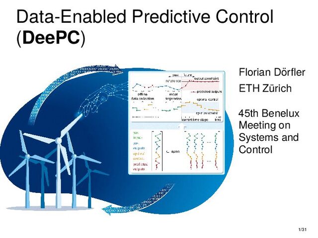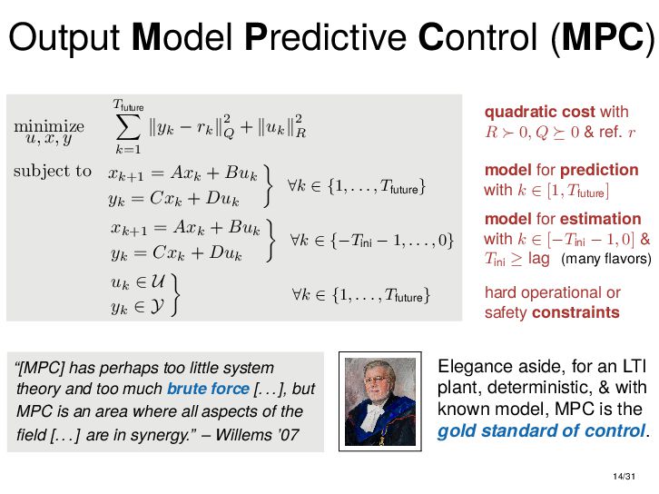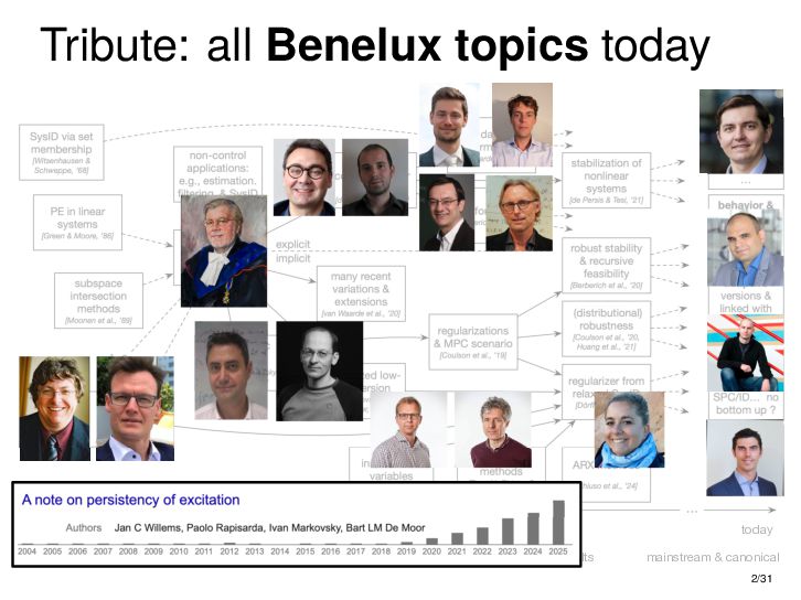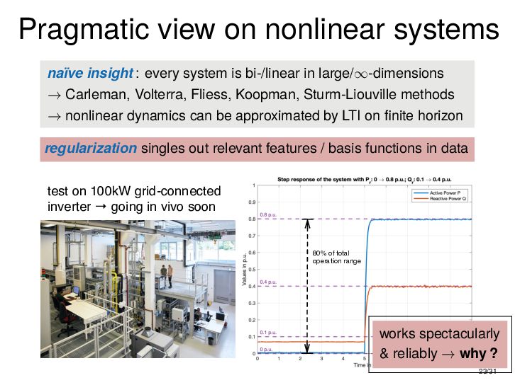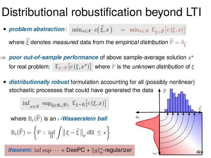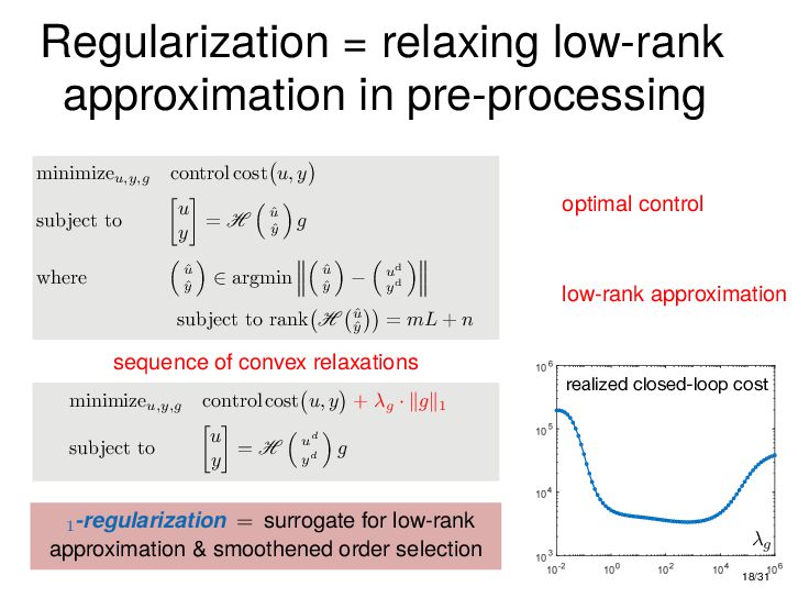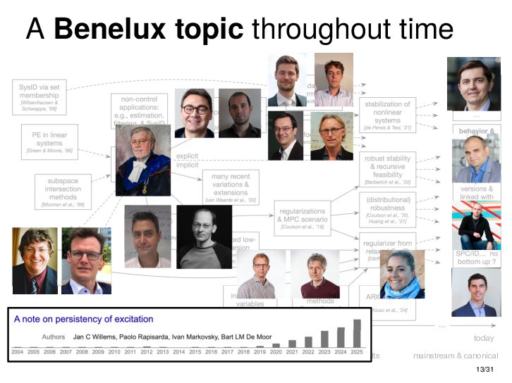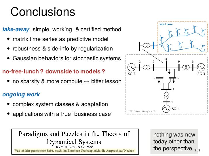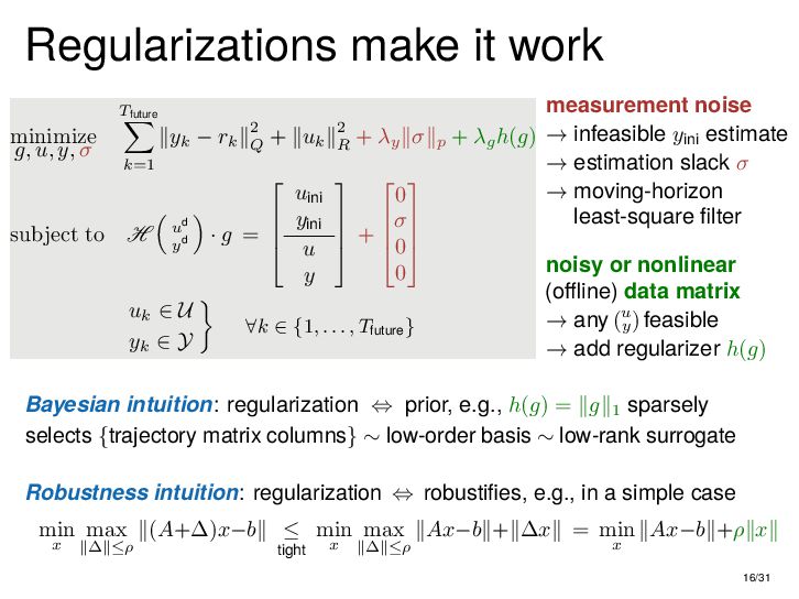 : ∃x ∈ RnT s.t. x+ = Ax + Bu , y = Cx + Du parametric state-space model non-parametric model from raw data colspan ud 1,1 yd 1,1 ud 1,2 yd 1,2 ud 1,3 yd 1,3 ... ud 2,1 yd 2,1 ud 2,2 yd 2,2 ud 2,3 yd 2,3 ... . . . . . . . . . . . . ud T,1 yd T,1 ud T,2 yd T,2 ud T,3 yd T,3 ... all trajectories constructible from finitely many previous trajectories • terminology fundamental is justified : motion primitives, subspace SysID, signal recovery, dictionary learning, (E)DMD, ... all implicitly rely on it • standing on the shoulders of giants: classic Willems’ result was only “if” & required further assumptions: Hankel, persistency of excitation, controllability • many recent extensions to other system classes (bi-linear, descriptor, LPV, delay, Wiener-Hammerstein, ...), quantitative versions, other data structures (mosaic Hankel, Page, ...), & other proof methods 11/31