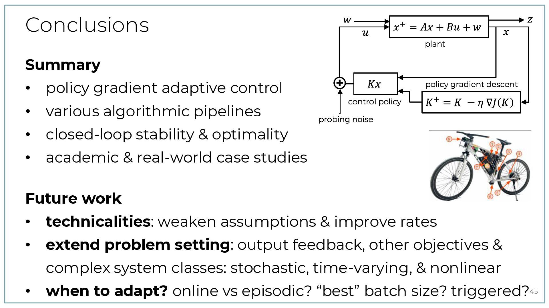 + 𝑇𝑟(𝐾𝑇𝑅𝐾Σ Annual Review of Control, Robotics , and AutonomousSys tems Toward aT heoretical Foundation of Policy Optimization for Learning Control Policies Bin Hu,1 Kaiqing Zhang,2,3 Na Li,4 Mehran Mesbahi,5 Maryam Fazel,6 and Tamer Ba¸ sar1 1Coordinated Science Laboratory and Department of Electrical and Computer Engineering, University of Illinois Urbana-Champaign, Urbana, Illinois, USA; email: binhu7@ illinois.edu, basar1@ illinois.edu 2Laboratory for Information and Decision Systems and Computer Science and Artif cial Intelligence Laboratory, Massachusetts Institute of Technology, Cambridge, Massachusetts, USA 3Current aff liation: Department of Electrical and Computer Engineering and Institute for Systems Research, University of Maryland, College Park, Maryland, USA; email: kaiqing@ umd.edu 4School of Engineering and Applied Sciences, Harvard University, Cambridge, Massachusetts, USA; email: nali@ seas.harvard.edu 5Department of Aeronautics and Astronautics, University of Washington, Seattle, Washington, USA; email: mesbahi@ uw.edu 6Department of Electrical and Computer Engineering, University of Washington, Seattle, Washington, USA; email: mfazel@ uw.edu Annu. Rev. Control Robot. Auton. Syst. 2023. 6:123–58 T he Annual Review of Control, Robotics , and AutonomousSystemsisonline at control.annualreviews.org https://doi.org/10.1146/annurev-control-042920- 020021 Copyright © 2023 by the author(s). T his work is licensed under aCreative Commons Attribution 4.0 International License, which permits unrestricted use, distribution, and reproduction in any medium, provided the original author and source are credited. See credit lines of images or other third-party material in this article for license information. Keywords policy optimization, reinforcement learning, feedback control synthesis Abstract Gradient-based methodshave been widely used for system design and opti- mization in diverse application domains. Recently, there hasbeen arenewed interest in studying theoretical propertiesof thesemethodsin thecontext of control and reinforcement learning. T hisarticle surveyssome of the recent developments on policy optimization, a gradient-based iterative approach for feedback control synthesis that hasbeen popularized by successesof re- inforcement learning. We take an interdisciplinary perspective in our expo- sition that connects control theory, reinforcement learning, and large-scale Fact: For initial 𝐾0 stabilizing & small 𝜂, gradient descent 𝐾+ = 𝐾 − 𝜂 ∇𝐽 𝐾 converges linearly to 𝐾∗. where Σ = 𝐼 + 𝐴 + 𝐵𝐾 Σ 𝐴 + 𝐵𝐾 𝑇 Algorithm: model-based adaptive control via policy gradient 1. data collection: refresh (𝑋0 , 𝑈0 , 𝑋1 ) 2. identification of 𝐵, መ 𝐴 via recursive LS 3. policy gradient: 𝐾+ = 𝐾 − 𝜂 ∇𝐽 𝐾 using estimates 𝐵, መ 𝐴 & closed-loop Gramians Σ, 𝑃 actuate & repeat 19