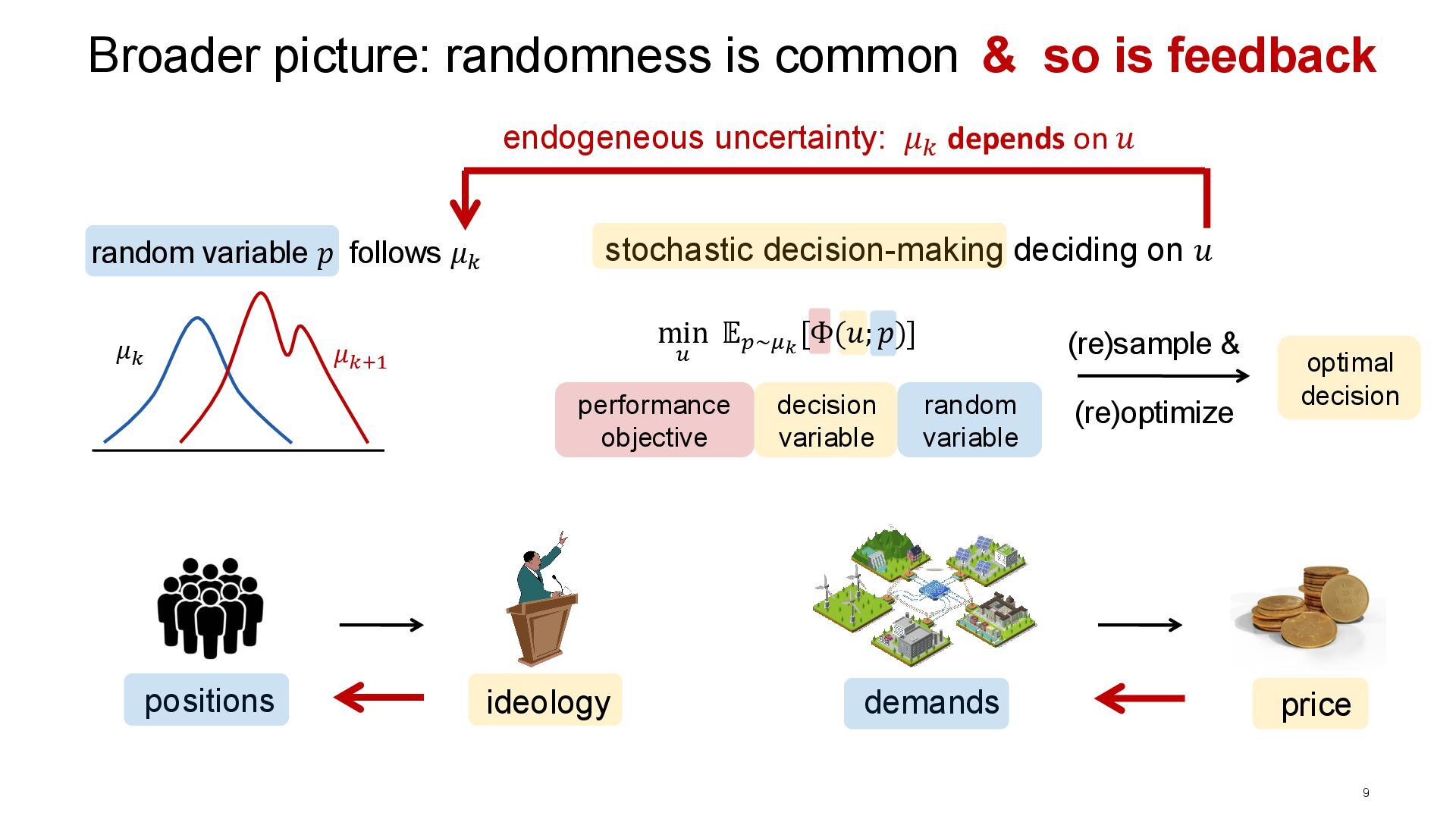 exact gradients of 𝔼𝑝∼𝜇ss 𝑢 [Φ(𝑢, 𝑝)] ∇෩ Φ 𝑢𝑘 = 𝔼𝑑∼𝜇𝑑 [∇Φ(𝑢𝑘 , ℎ(𝑢𝑘 , 𝑑))] = 𝔼𝑑∼𝜇𝑑 [∇𝑢 Φ(𝑢𝑘 , ℎ(𝑢𝑘 , 𝑑)) + ∇𝑢 ℎ 𝑢𝑘 , 𝑑 𝛻𝑝 Φ(𝑢𝑘 , 𝑝)|𝑝=ℎ(𝑢𝑘,𝑑) ] = 𝔼(𝑝,𝑑)∼𝛾ss(𝑢𝑘) [∇𝑢 Φ(𝑢𝑘 , 𝑝) + ∇𝑢 ℎ(𝑢𝑘 , 𝑑) ∇𝑝 Φ(𝑢𝑘 , 𝑝)] steady state induced by 𝑑 ∼ 𝜇𝑑 & 𝑝 ∼ ℎ(𝑢,⋅)# 𝜇𝑑 chain rule & law of total derivative conditions on Φ allow swapping ∇ & 𝔼 Challenges hard to evaluate 𝔼 (integral) no access to the steady state online decision-making! use current samples from 𝜇𝑘 = 𝔼𝑑∼𝜇𝑑 Φ 𝑢, ℎ 𝑢, 𝑑 ≜ ෩ Φ(𝑢)