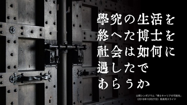 公開シンポジウム「博士キャリアの可能性」(2018年10月27日、於東京・日本学術会議講堂)における発表のためのスライド。なお、発表時に使用したものに若干の修正を加えています。発表原稿は以下の場所にあります → http://id.fnshr.info/2018/10/28/guushita/