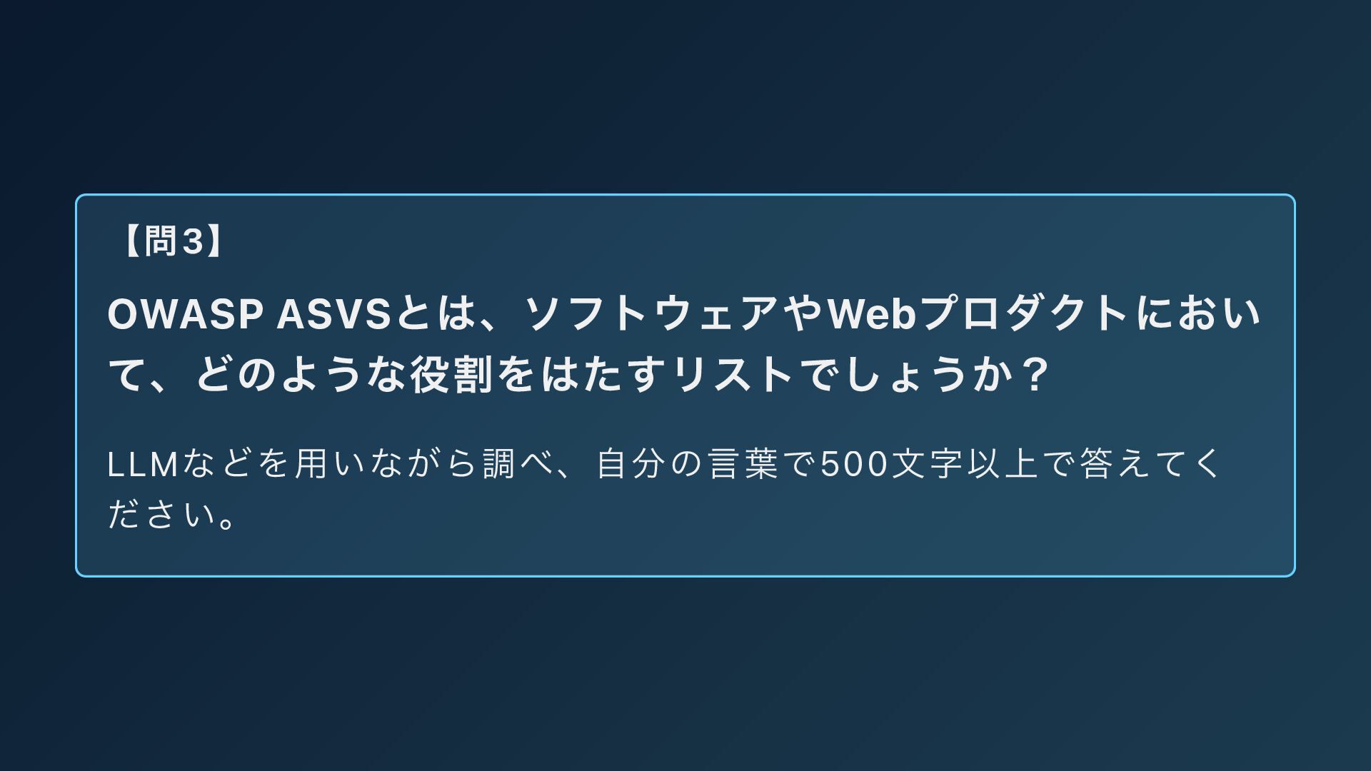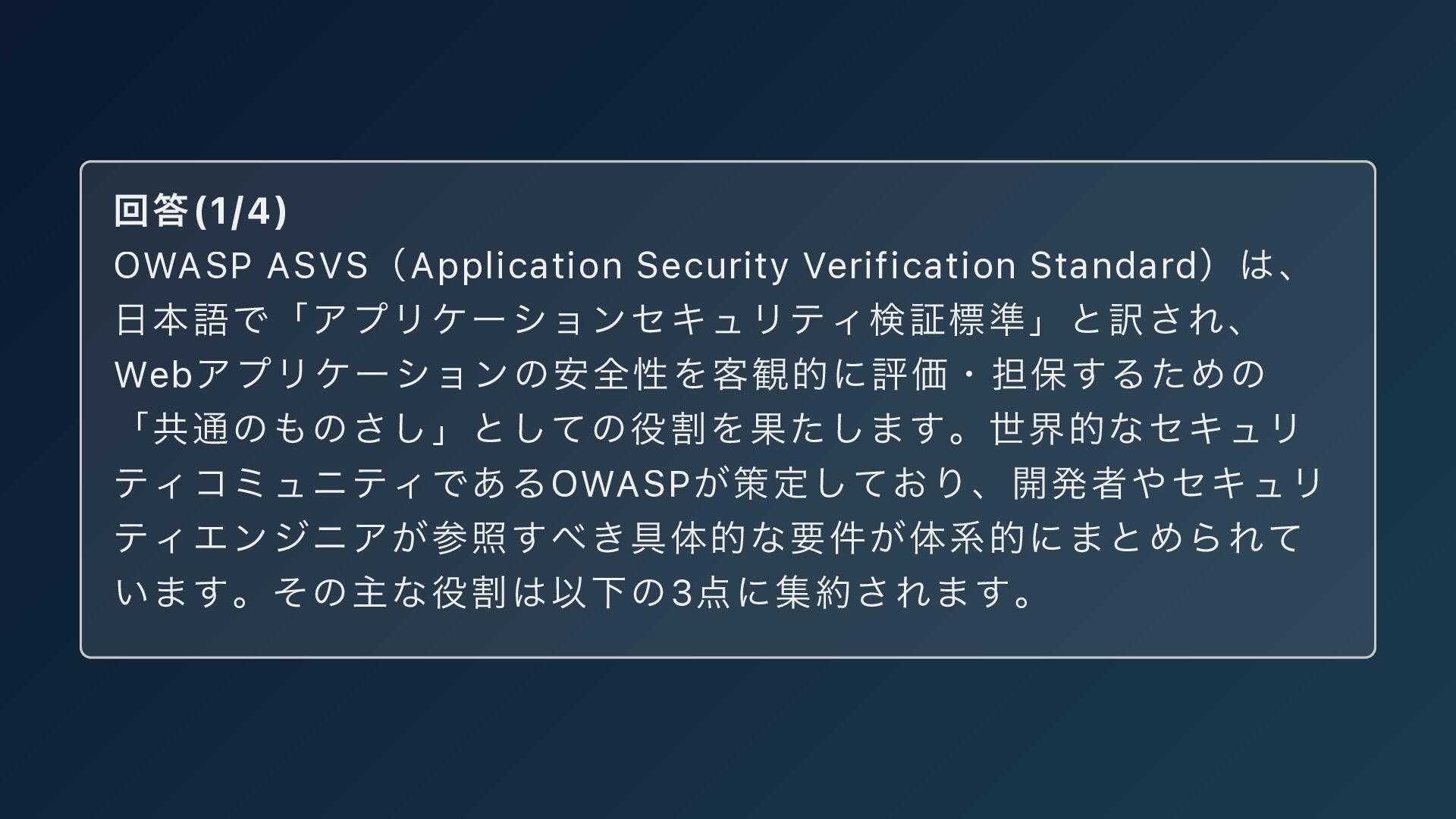 ʲ3ʳ OWASP ASVSͱɺιϑτΣΞWebϓϩμΫτʹ͓͍ ͯɺͲͷΑ͏ͳׂΛͨ͢ϦετͰ͠ΐ͏͔ʁ LLMͳͲΛ༻͍ͳ͕Βௐɺࣗͷݴ༿Ͱ500จࣈҎ্Ͱ͑ͯ͘ ͍ͩ͞ɻ