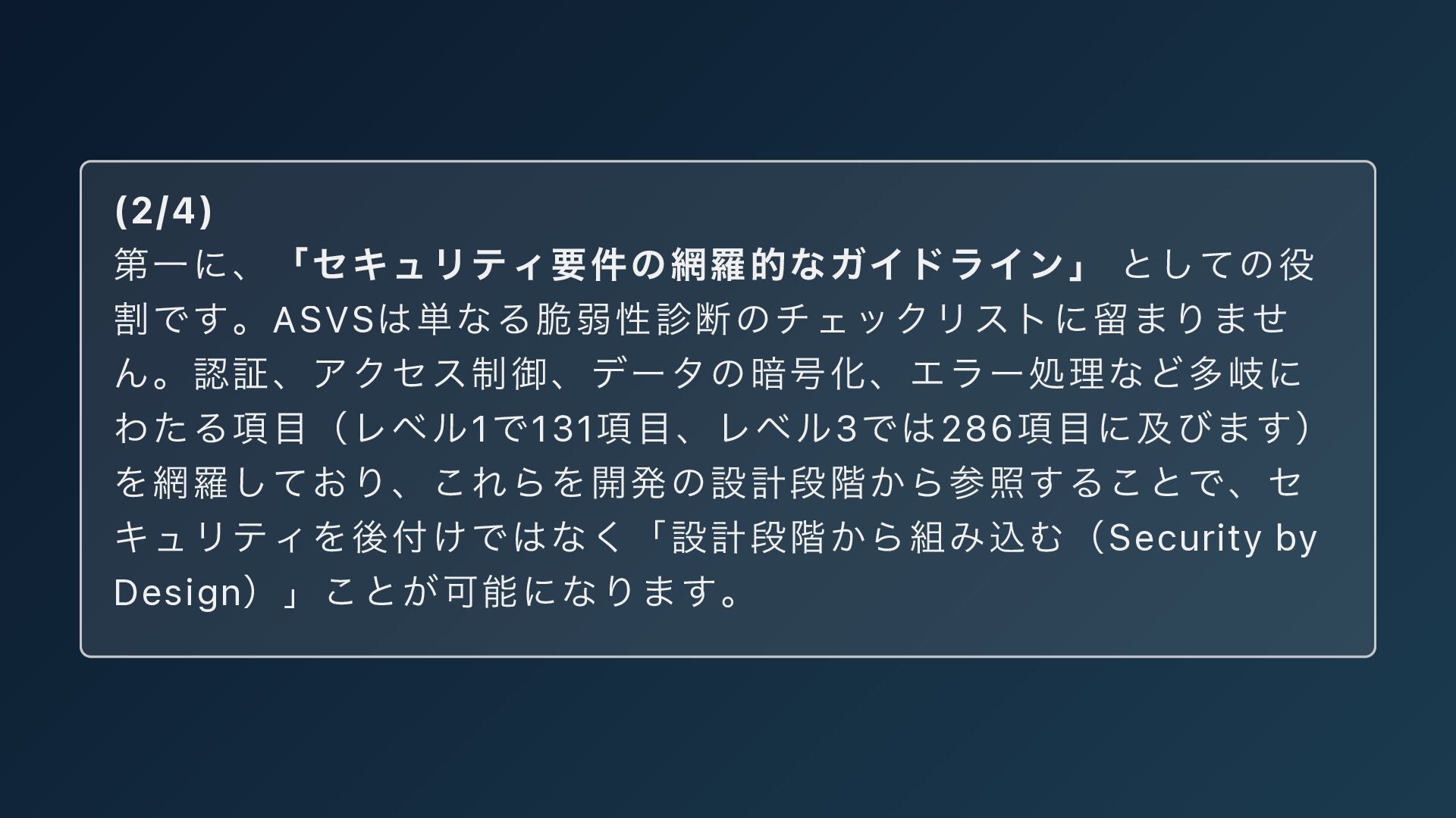 (2/4) ୈҰʹɺʮηΩϡϦςΟཁ݅ͷཏతͳΨΠυϥΠϯʯ ͱͯ͠ͷ ׂͰ͢ɻASVS୯ͳΔ੬ऑੑஅͷνΣοΫϦετʹཹ·Γ·ͤ ΜɻೝূɺΞΫηε੍ޚɺσʔλͷ҉߸ԽɺΤϥʔॲཧͳͲଟذʹ ΘͨΔ߲ʢϨϕϧ1Ͱ131߲ɺϨϕϧ3Ͱ286߲ʹٴͼ·͢ʣ Λཏ͓ͯ͠Γɺ͜ΕΒΛ։ൃͷઃܭஈ֊͔Βࢀর͢Δ͜ͱͰɺη ΩϡϦςΟΛޙ͚Ͱͳ͘ʮઃܭஈ֊͔ΒΈࠐΉʢSecurity by Designʣʯ͜ͱ͕ՄೳʹͳΓ·͢ɻ