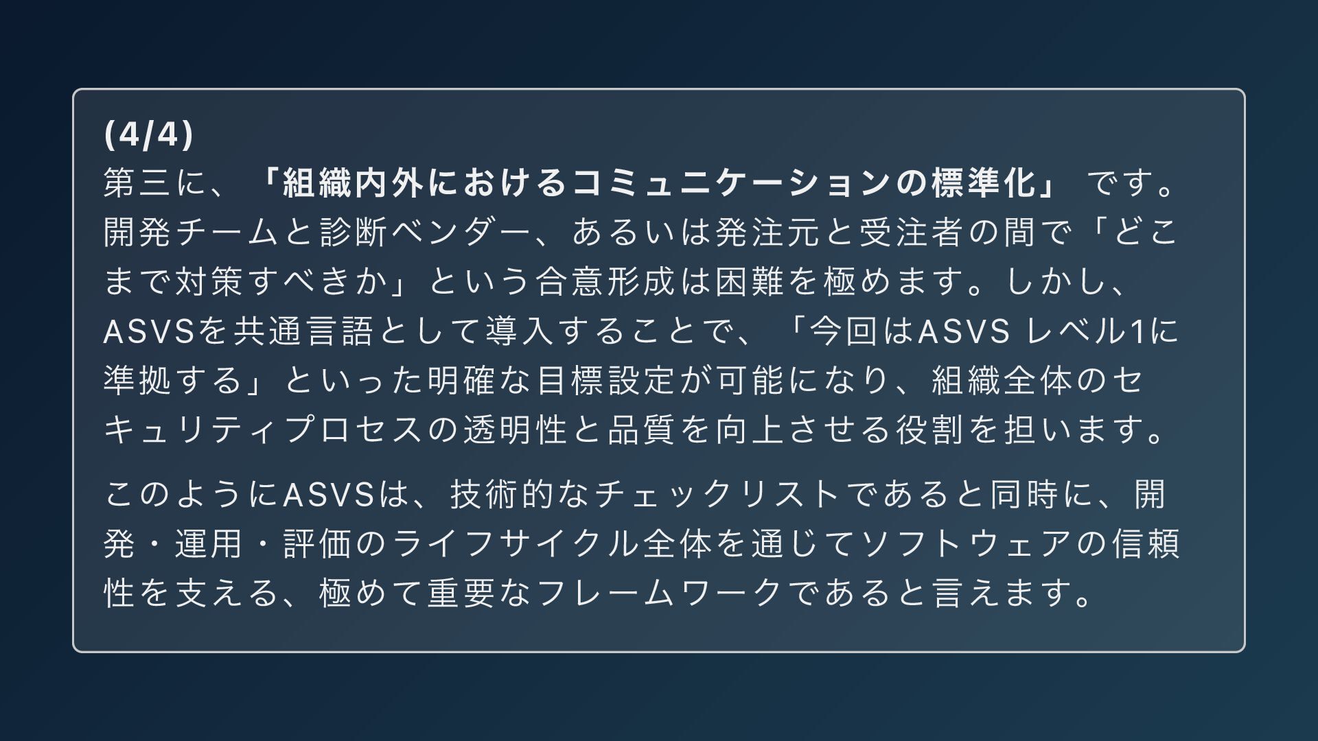 (4/4) ୈࡾʹɺʮ৫֎ʹ͓͚Δίϛϡχέʔγϣϯͷඪ४Խʯ Ͱ͢ɻ ։ൃνʔϜͱஅϕϯμʔɺ͋Δ͍ൃݩͱडऀͷؒͰʮͲ͜ ·Ͱରࡦ͖͔͢ʯͱ͍͏߹ҙܗࠔΛۃΊ·͢ɻ͔͠͠ɺ ASVSΛڞ௨ݴޠͱͯ͠ಋೖ͢Δ͜ͱͰɺʮࠓճASVS Ϩϕϧ1ʹ ४ڌ͢Δʯͱ͍ͬͨ໌֬ͳඪઃఆ͕ՄೳʹͳΓɺ৫શମͷη ΩϡϦςΟϓϩηεͷಁ໌ੑͱ࣭Λ্ͤ͞ΔׂΛ୲͍·͢ɻ ͜ͷΑ͏ʹASVSɺٕज़తͳνΣοΫϦετͰ͋Δͱಉ࣌ʹɺ։