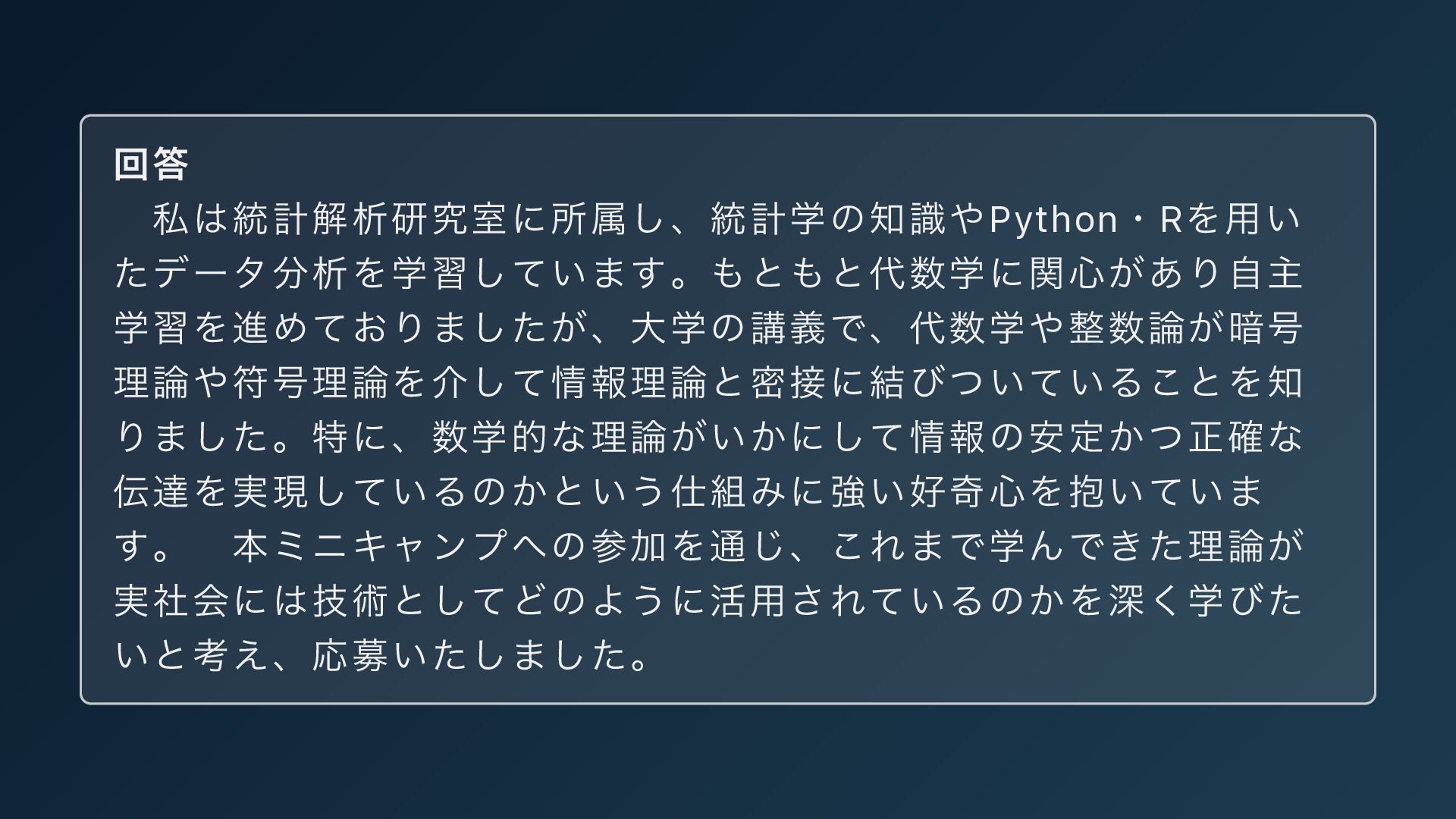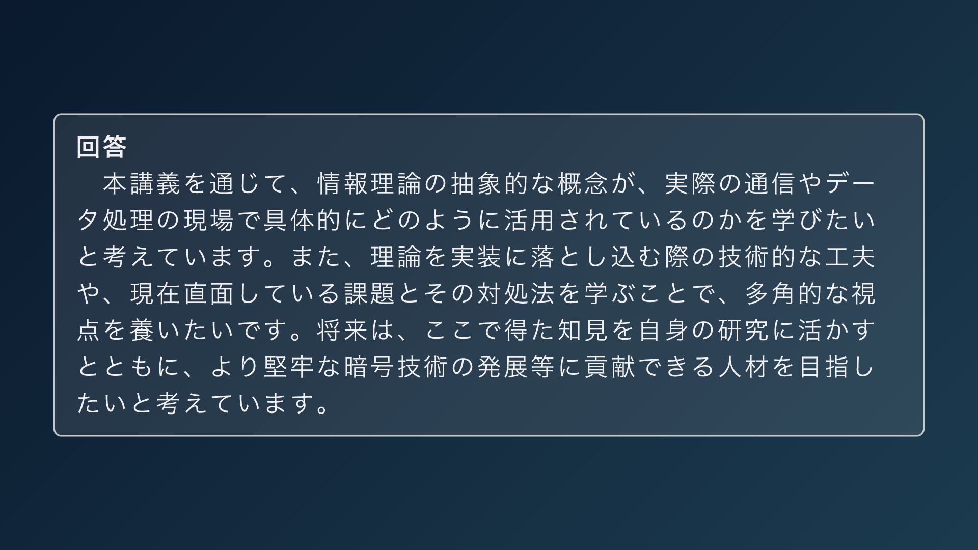ճ ɹຊߨٛΛ௨ͯ͡ɺใཧͷநతͳ֓೦͕ɺ࣮ࡍͷ௨৴σʔ λॲཧͷݱͰ۩ମతʹͲͷΑ͏ʹ׆༻͞Ε͍ͯΔͷ͔Λֶͼ͍ͨ ͱߟ͍͑ͯ·͢ɻ·ͨɺཧΛ࣮ʹམͱ͠ࠐΉࡍͷٕज़తͳ ɺݱࡏ໘͍ͯ͠Δ՝ͱͦͷରॲ๏ΛֶͿ͜ͱͰɺଟ֯తͳࢹ Λཆ͍͍ͨͰ͢ɻকདྷɺ͜͜ͰಘͨݟΛࣗͷݚڀʹ׆͔͢ ͱͱʹɺΑΓݎ࿚ͳ҉߸ٕज़ͷൃలʹߩݙͰ͖ΔਓࡐΛࢦ͠ ͍ͨͱߟ͍͑ͯ·͢ɻ