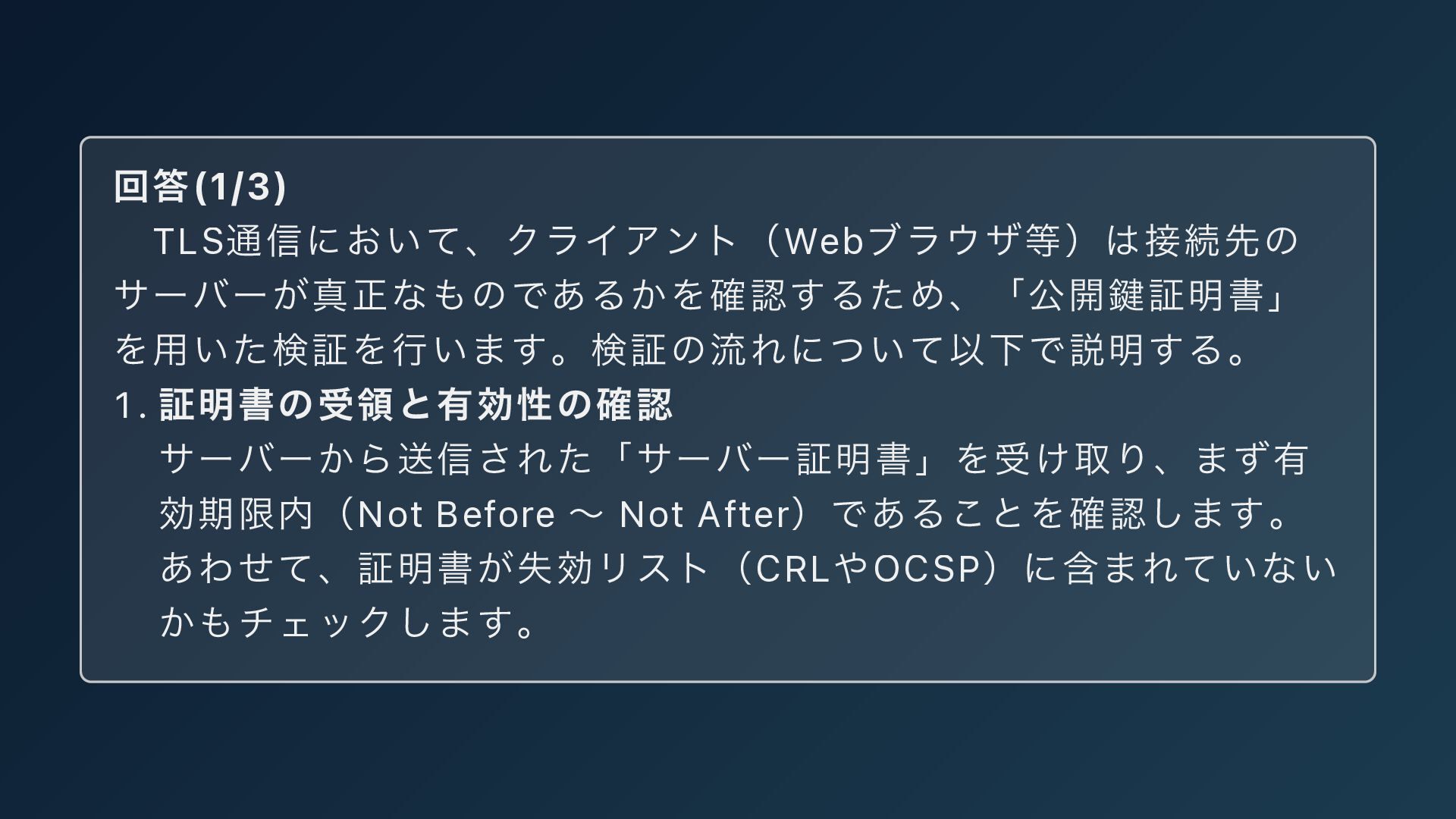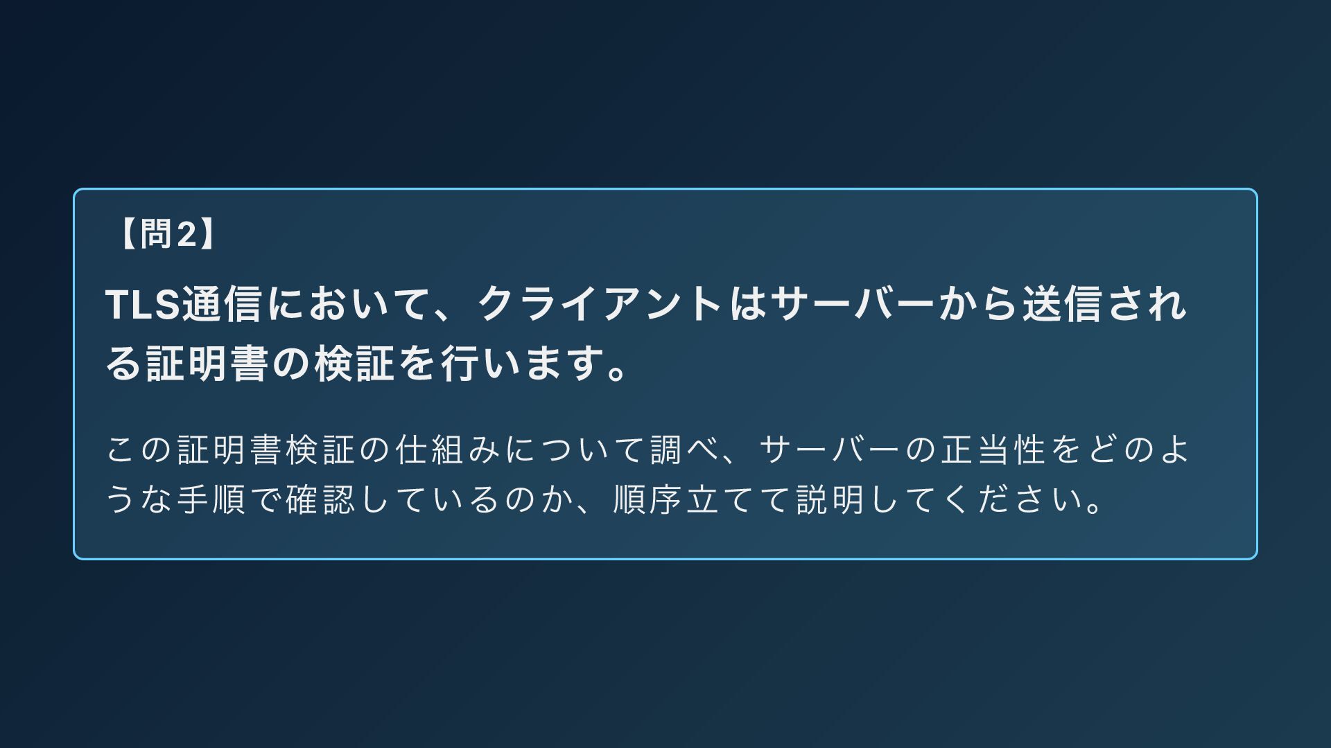 ʲ2ʳ TLS௨৴ʹ͓͍ͯɺΫϥΠΞϯταʔόʔ͔Βૹ৴͞Ε Δূ໌ॻͷݕূΛߦ͍·͢ɻ ͜ͷূ໌ॻݕূͷΈʹ͍ͭͯௐɺαʔόʔͷਖ਼ੑΛͲͷΑ ͏ͳखॱͰ֬ೝ͍ͯ͠Δͷ͔ɺॱংཱͯͯઆ໌͍ͯͩ͘͠͞ɻ