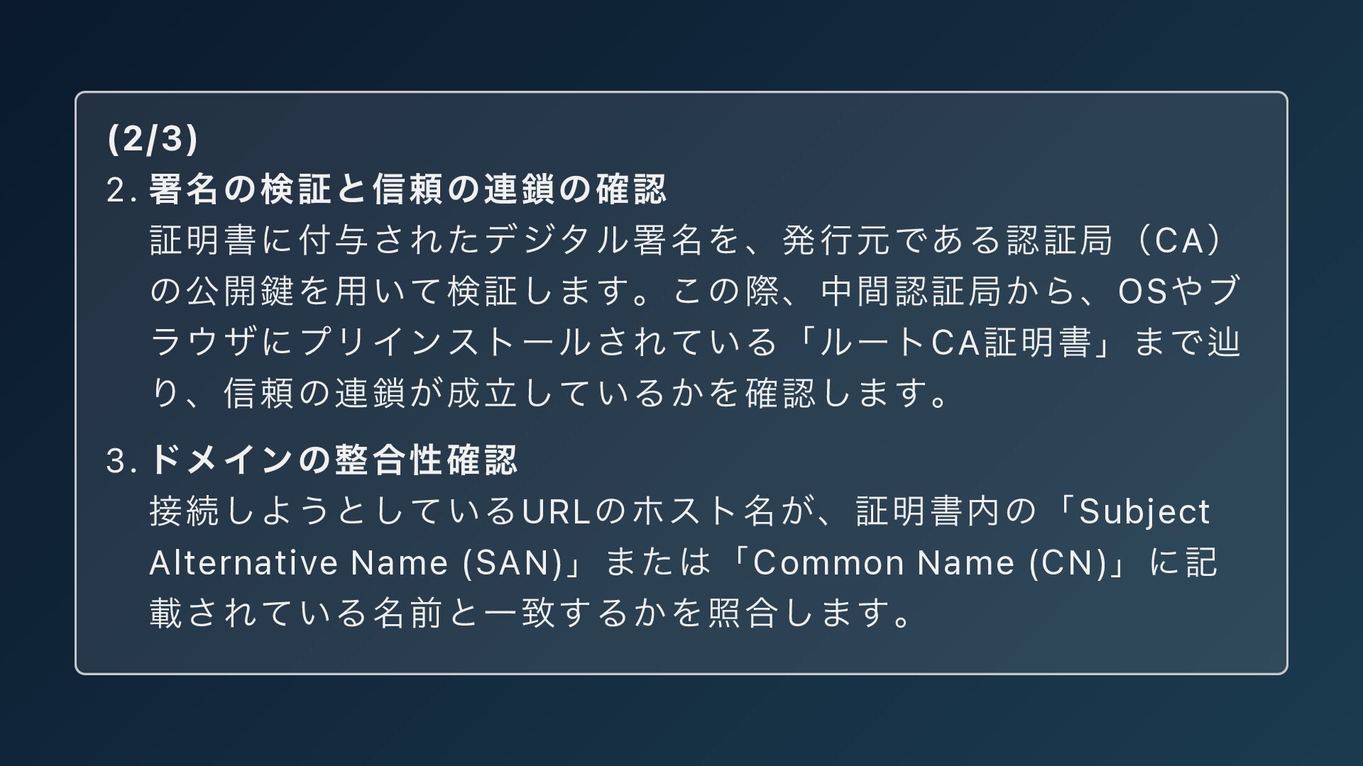 (2/3) 2. ॺ໊ͷݕূͱ৴པͷ࿈ͷ֬ೝ ূ໌ॻʹ༩͞Εͨσδλϧॺ໊ΛɺൃߦݩͰ͋ΔೝূہʢCAʣ ͷެ։伴Λ༻͍ͯݕূ͠·͢ɻ͜ͷࡍɺதؒೝূہ͔ΒɺOSϒ ϥβʹϓϦΠϯετʔϧ͞Ε͍ͯΔʮϧʔτCAূ໌ॻʯ·Ͱḷ Γɺ৴པͷ࿈ཱ͕͍ͯ͠Δ͔Λ֬ೝ͠·͢ɻ 3. υϝΠϯͷ߹ੑ֬ೝ ଓ͠Α͏ͱ͍ͯ͠ΔURLͷϗετ໊͕ɺূ໌ॻͷʮSubject
