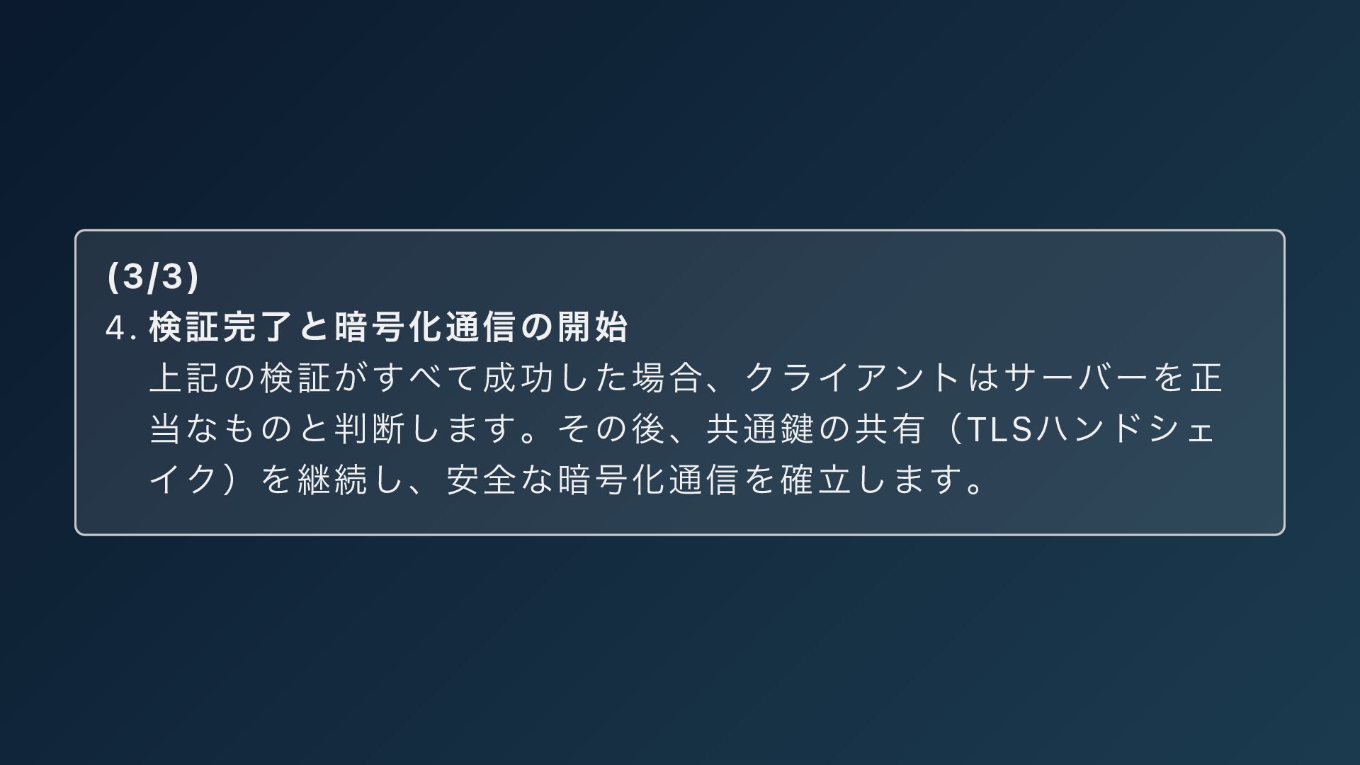 (3/3) 4. ݕূྃͱ҉߸Խ௨৴ͷ։࢝ ্هͷݕূ͕ͯ͢ޭͨ͠߹ɺΫϥΠΞϯταʔόʔΛਖ਼ ͳͷͱஅ͠·͢ɻͦͷޙɺڞ௨伴ͷڞ༗ʢTLSϋϯυγΣ ΠΫʣΛܧଓ͠ɺ҆શͳ҉߸Խ௨৴Λཱ֬͠·͢ɻ