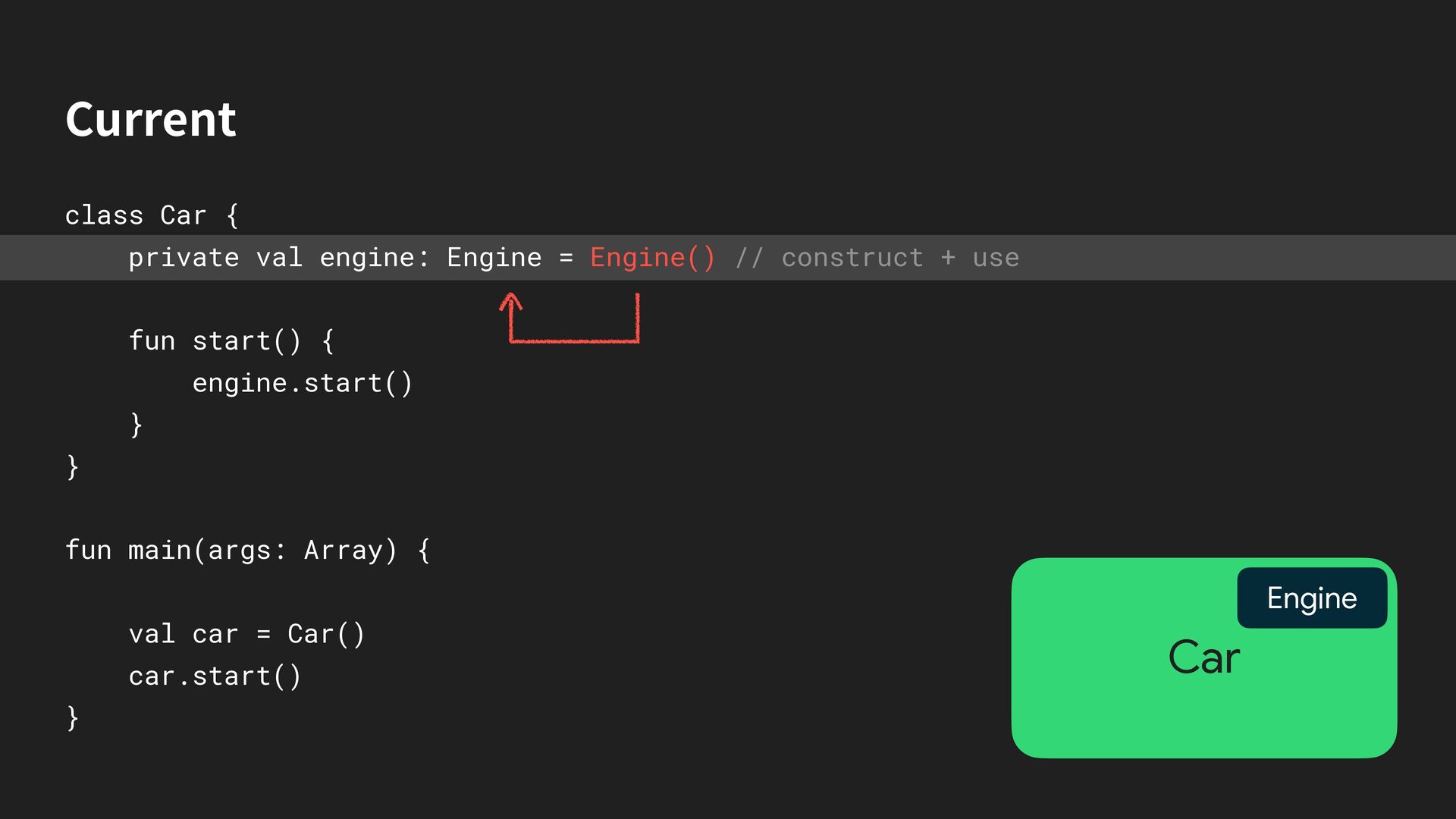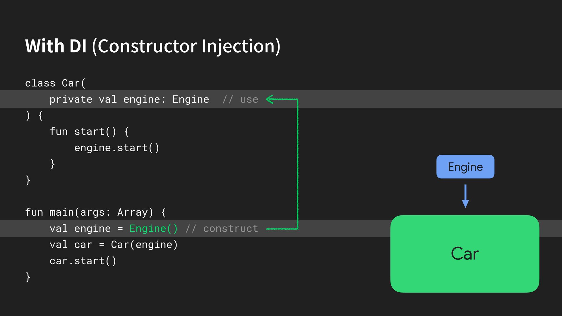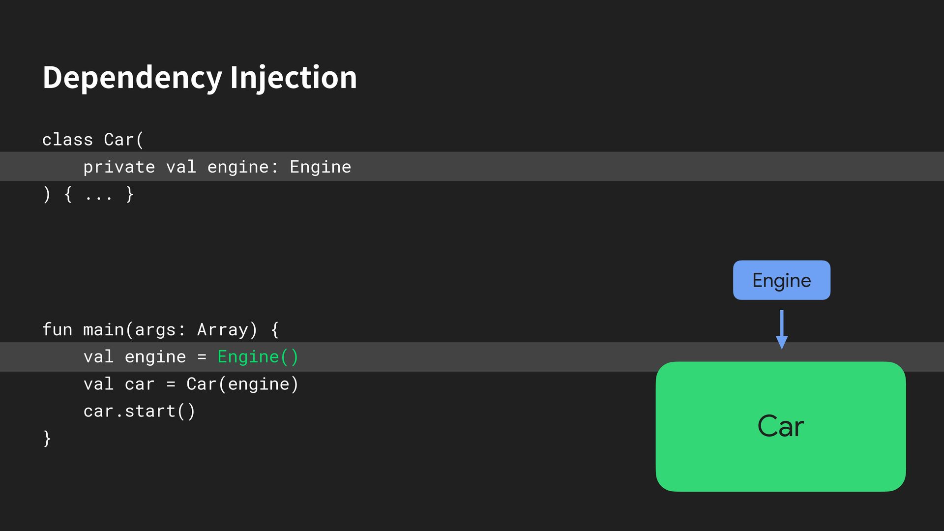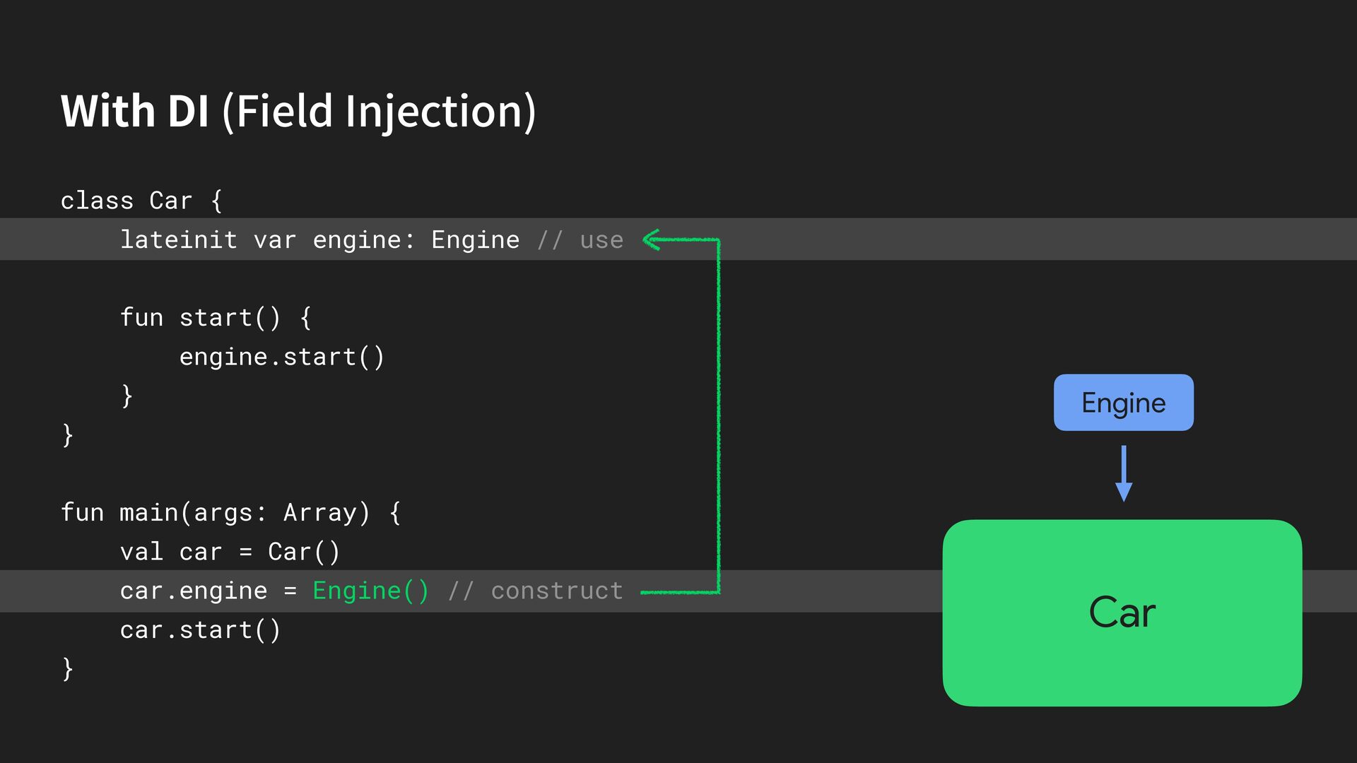 start() { engine.start() } } fun main(args: Array) { val car = Car() car.engine = Engine() // construct car.start() } With DI (Field Injection) Car Engine