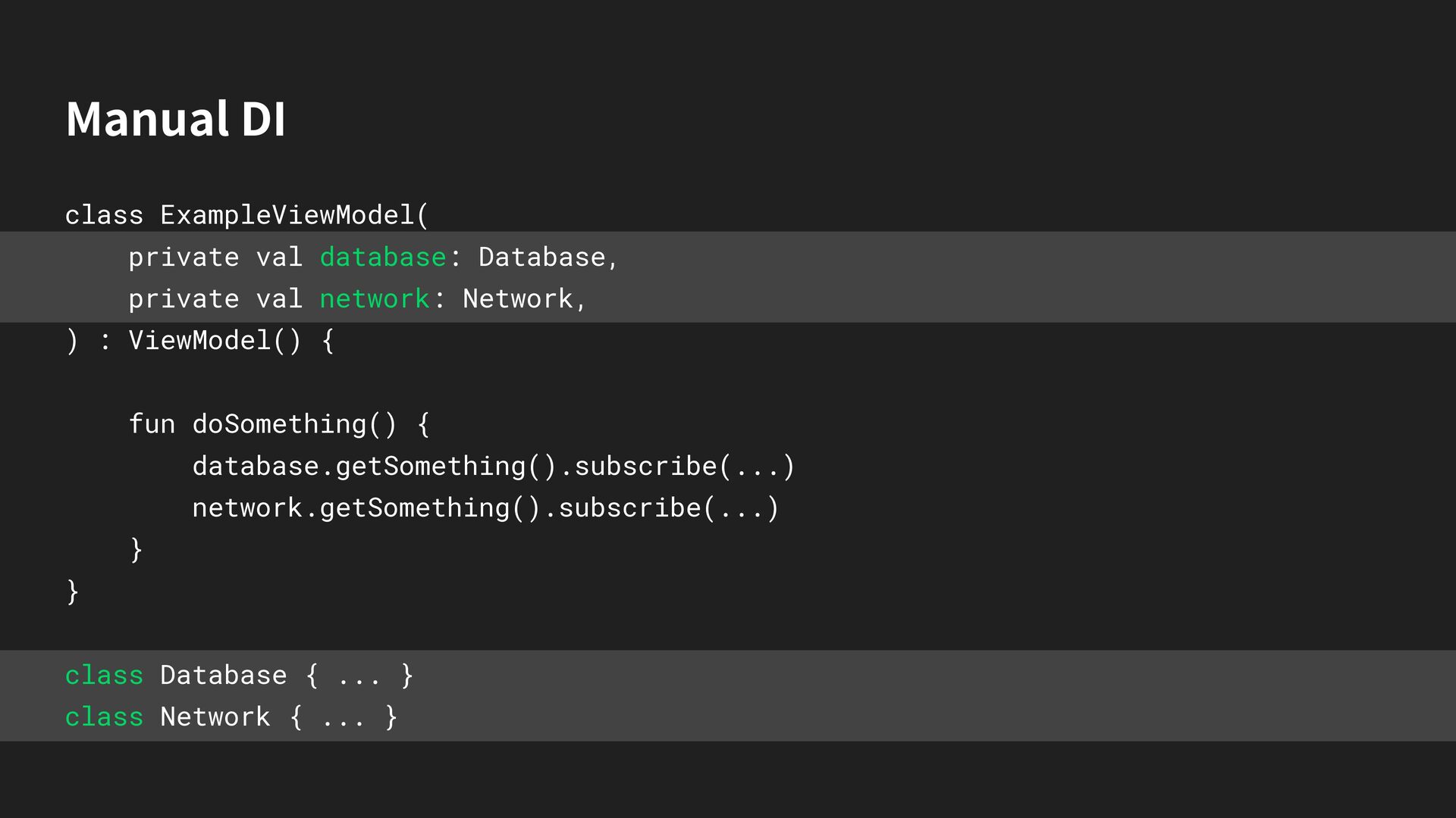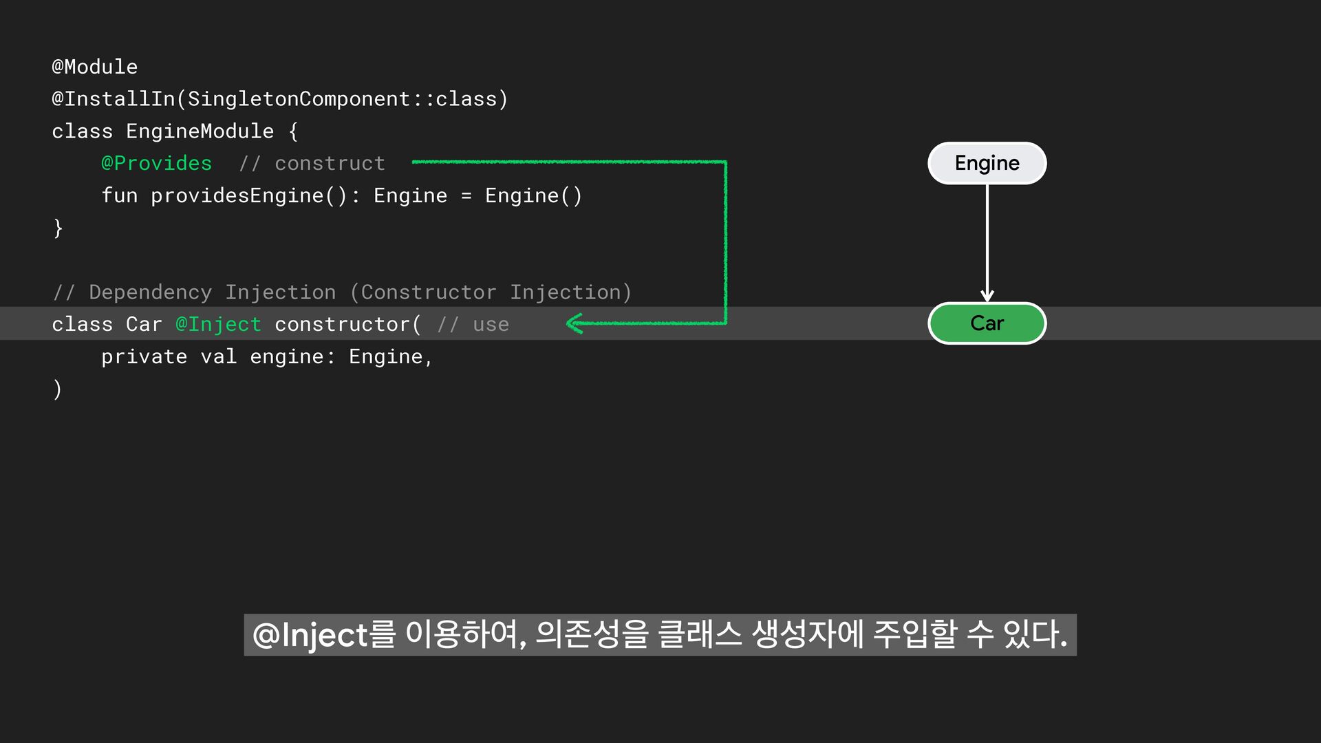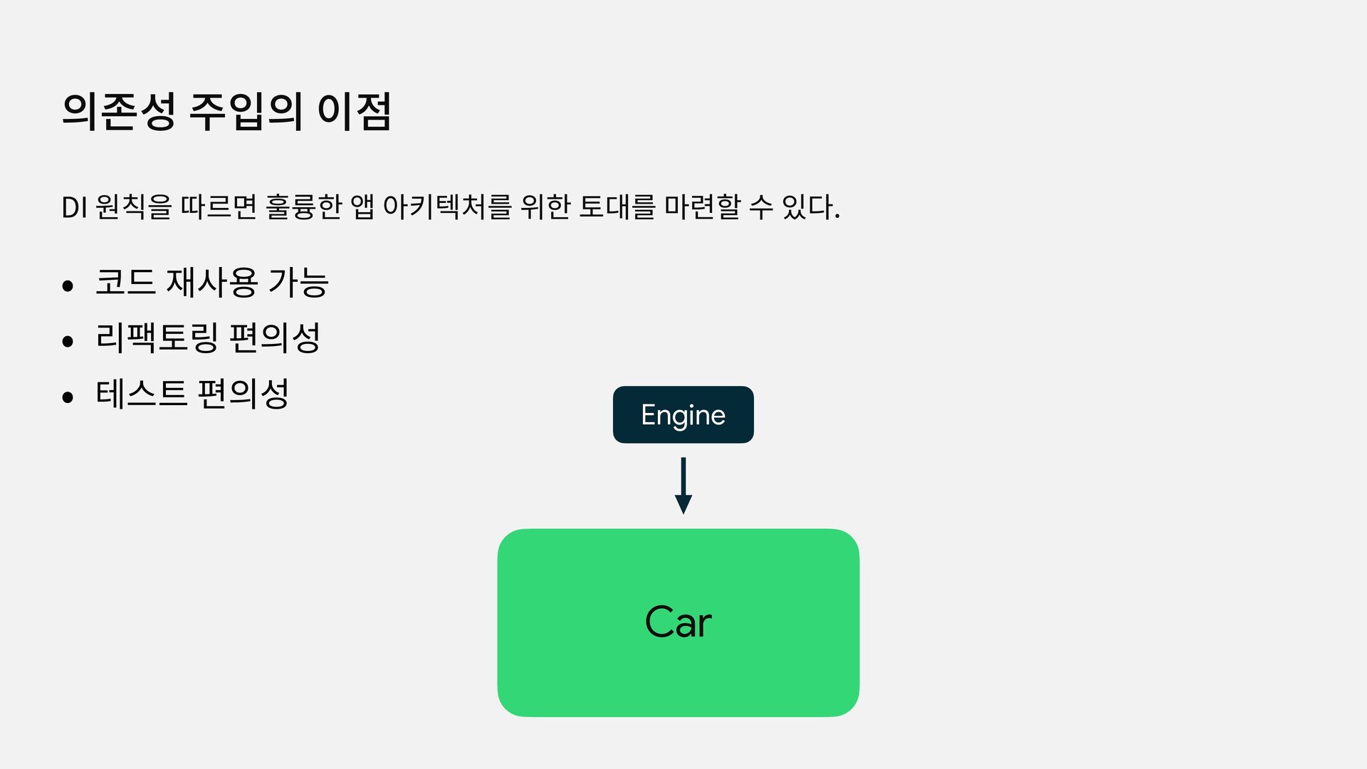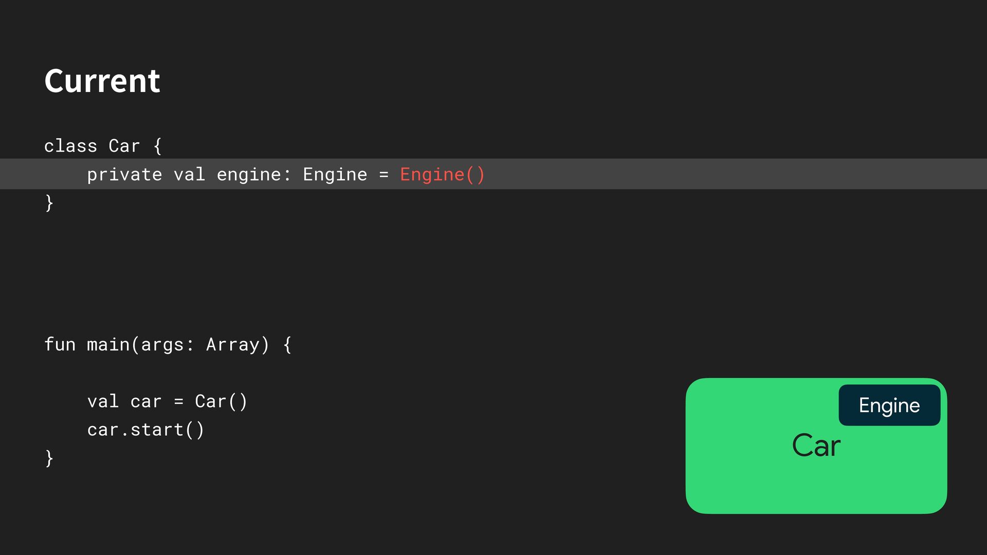 start() { engine.start() } } fun main(args: Array) { val car = Car() car.engine = Engine() // construct car.start() } With DI (Field Injection) Car Engine