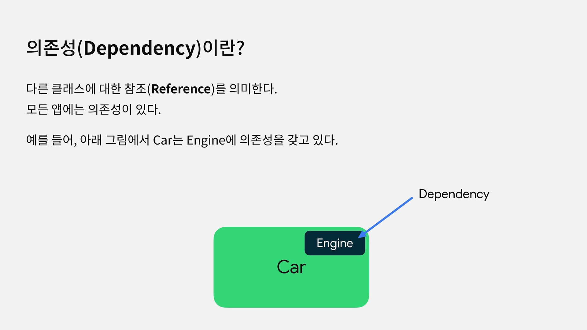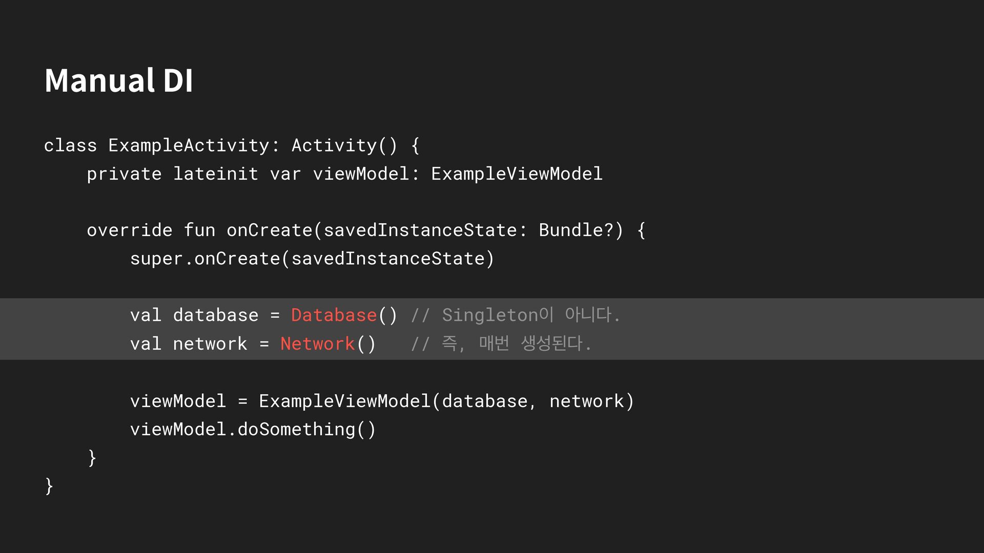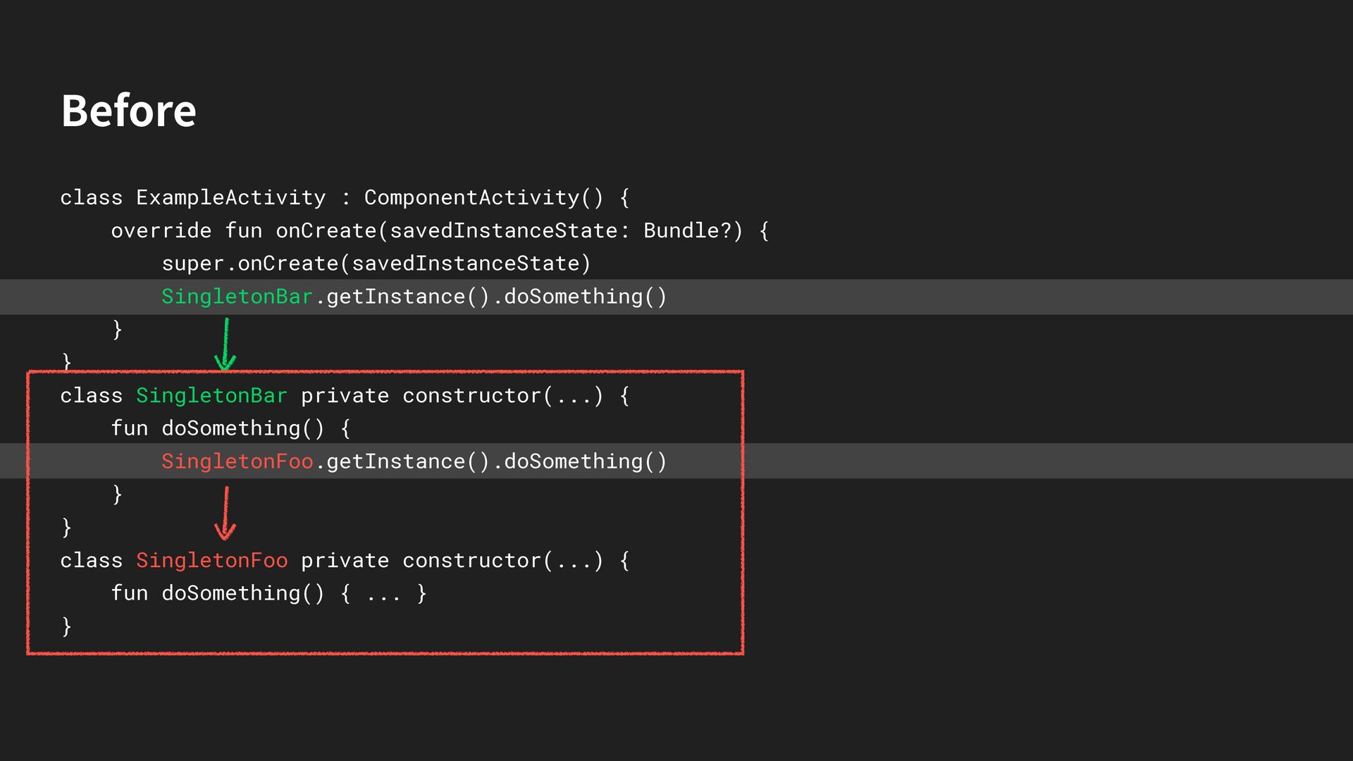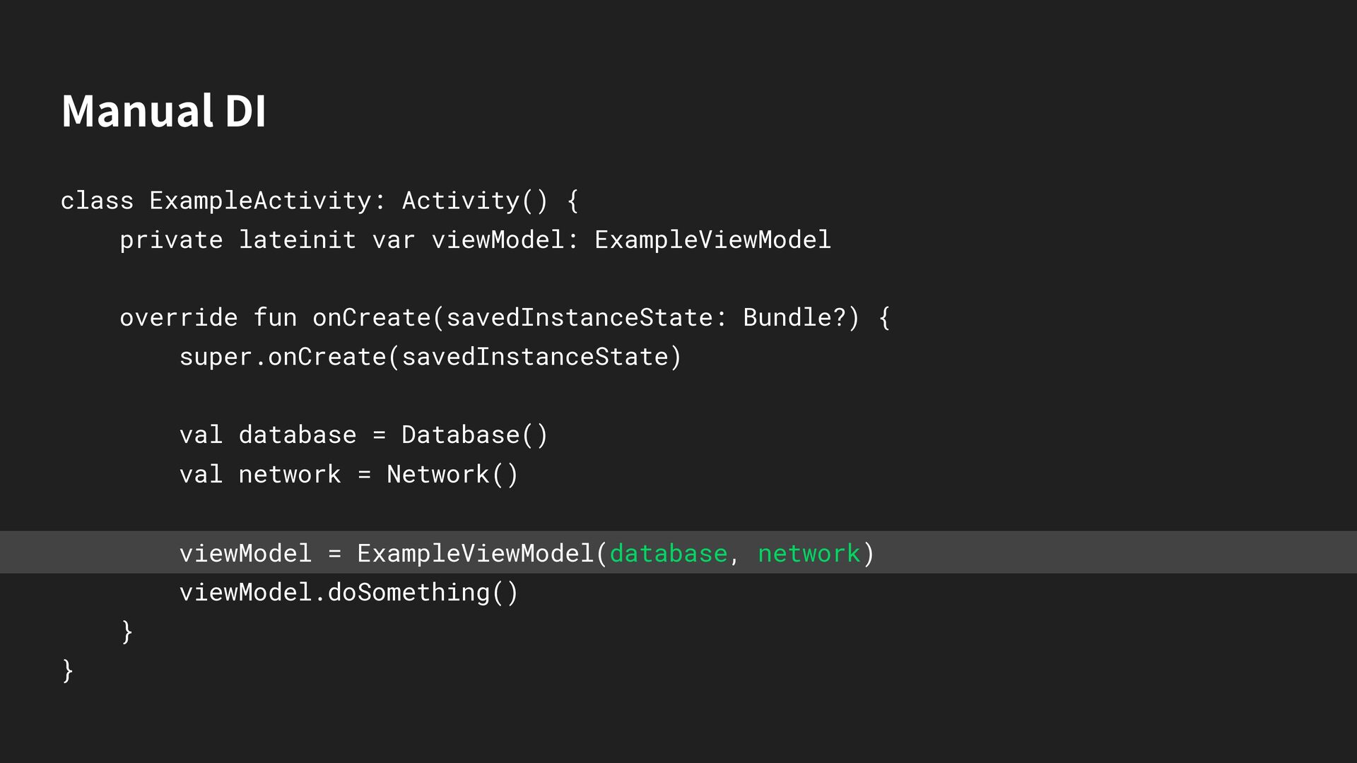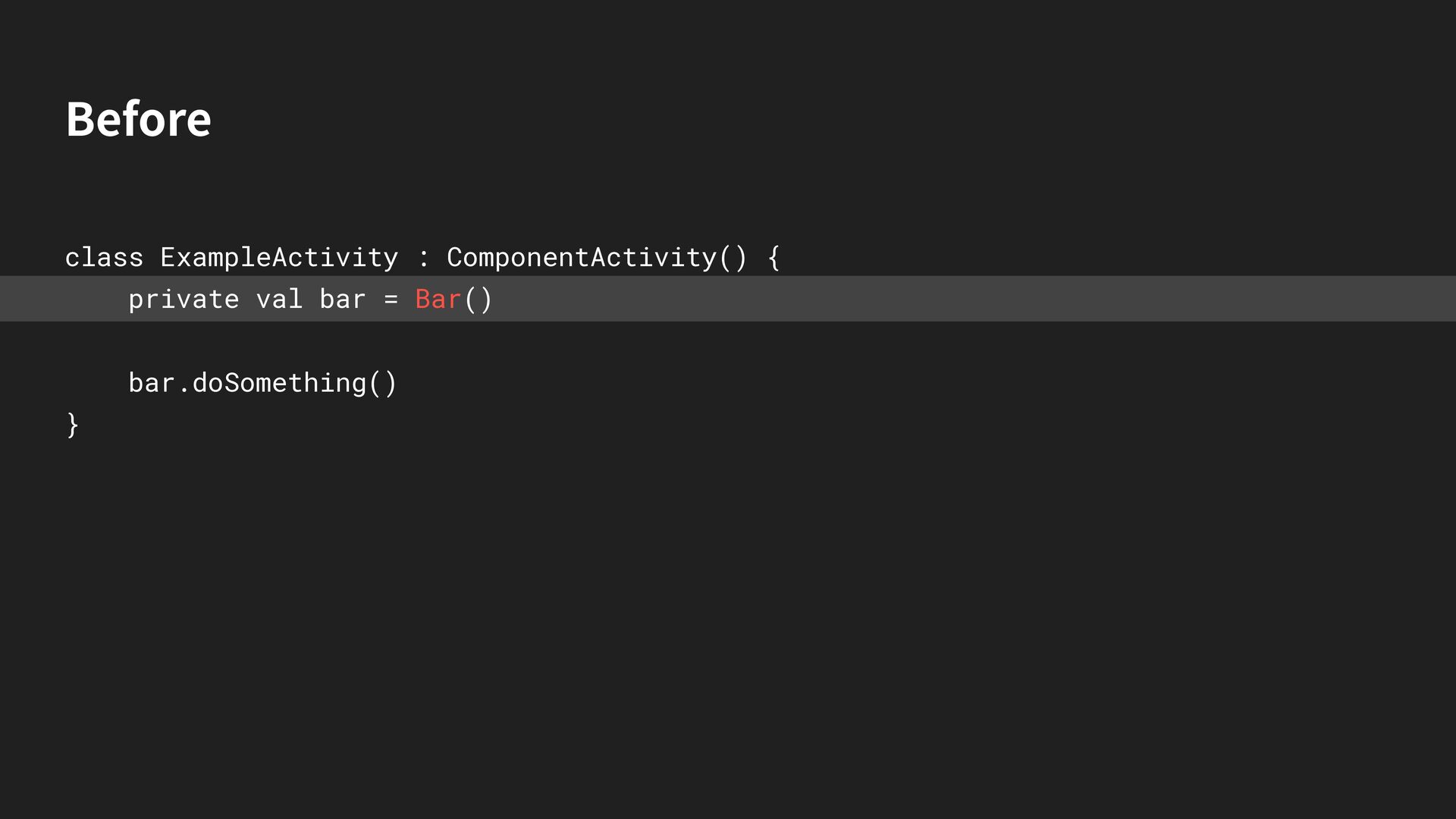 start() { engine.start() } } fun main(args: Array) { val car = Car() car.engine = Engine() // construct car.start() } With DI (Field Injection) Car Engine